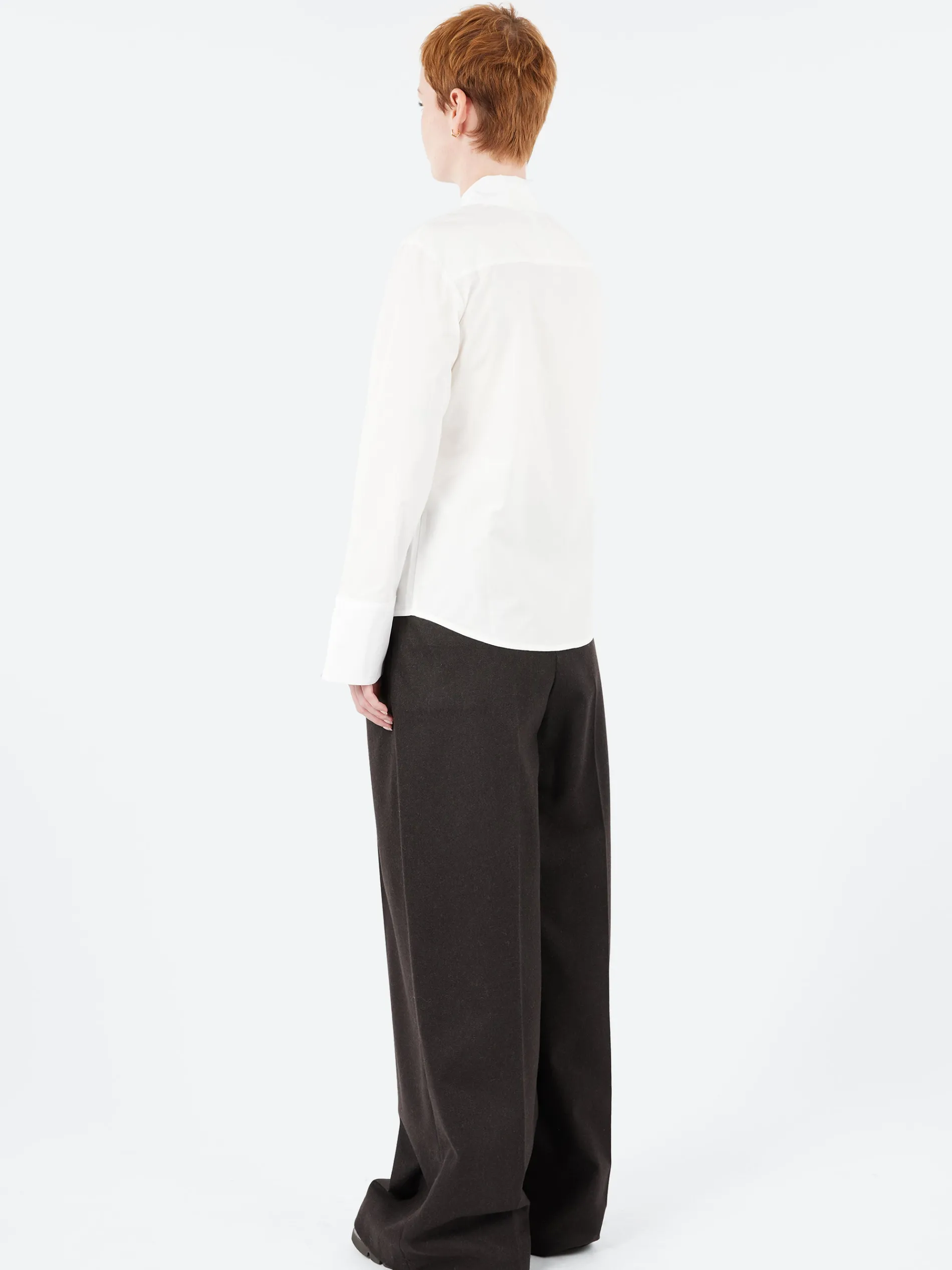 This white shirt from A.P.C. embodies a minimalist, refined aesthetic. It features a straight cut that offers a clean, flattering silhouette. The rounded collar adds a soft, subtle detail, while the hidden buttoning maintains a sleek, uninterrupted front. Large slit cuffs enhance the modern feel, making this shirt a versatile and stylish addition to any wardrobe.