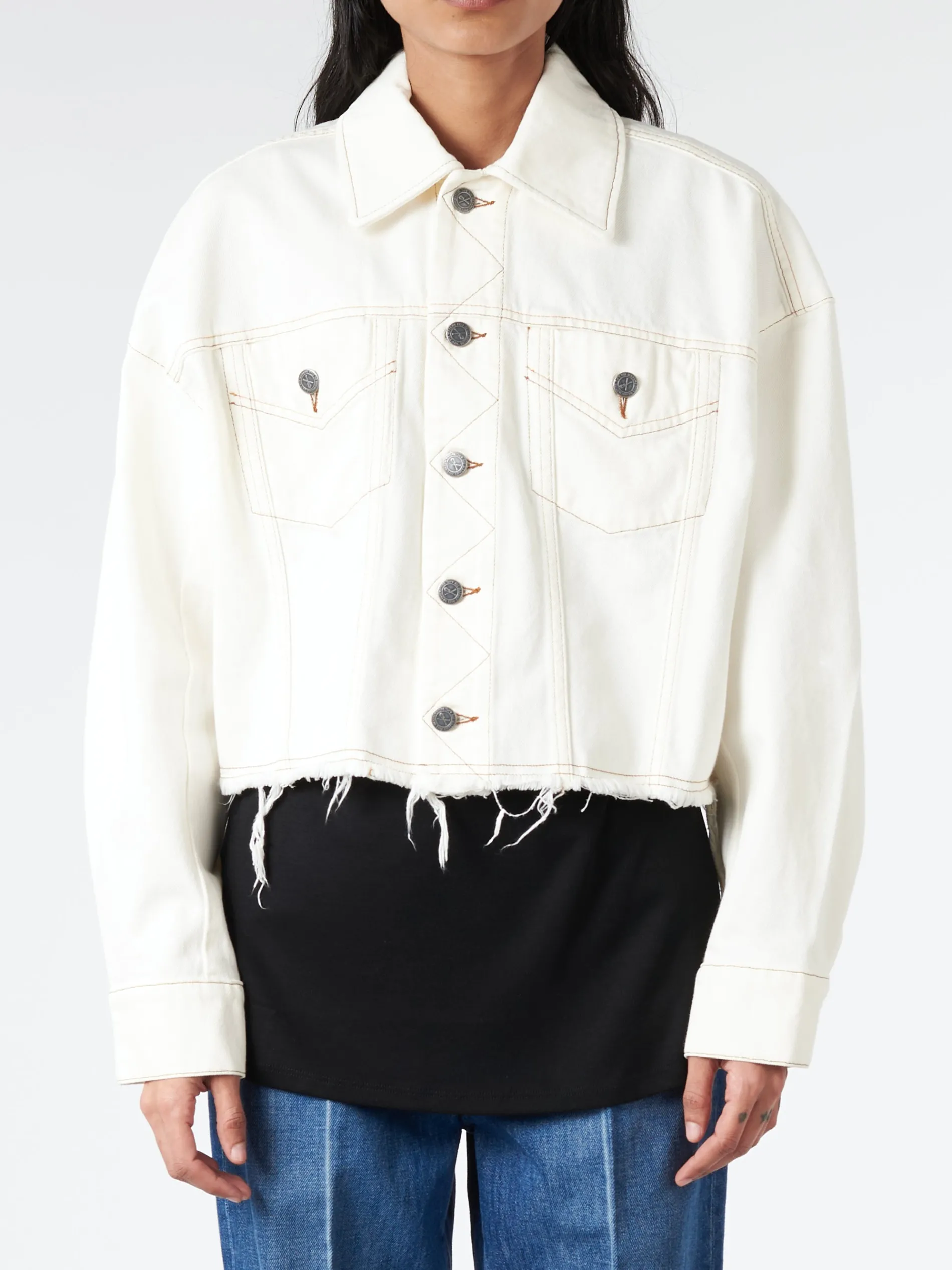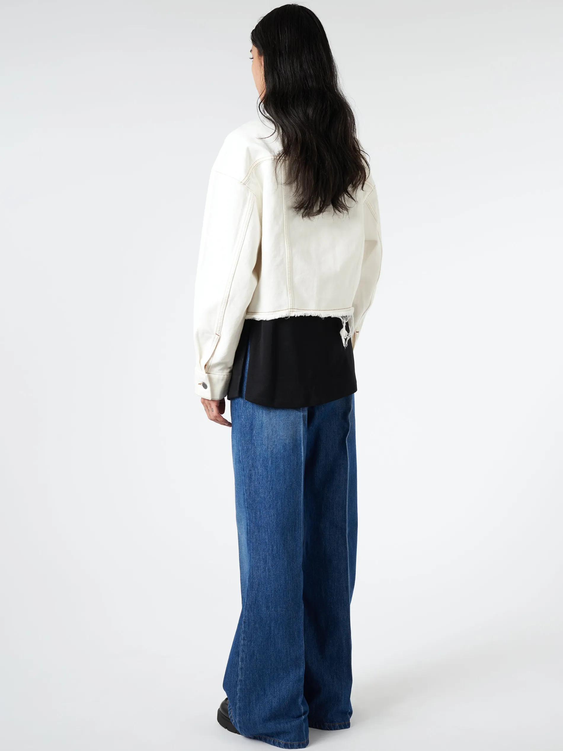 A.P.C. jean jacket in organic ecru denim with raw hem. Part of the A.P.C. x Natacha Ramsay-Levi collaboration.