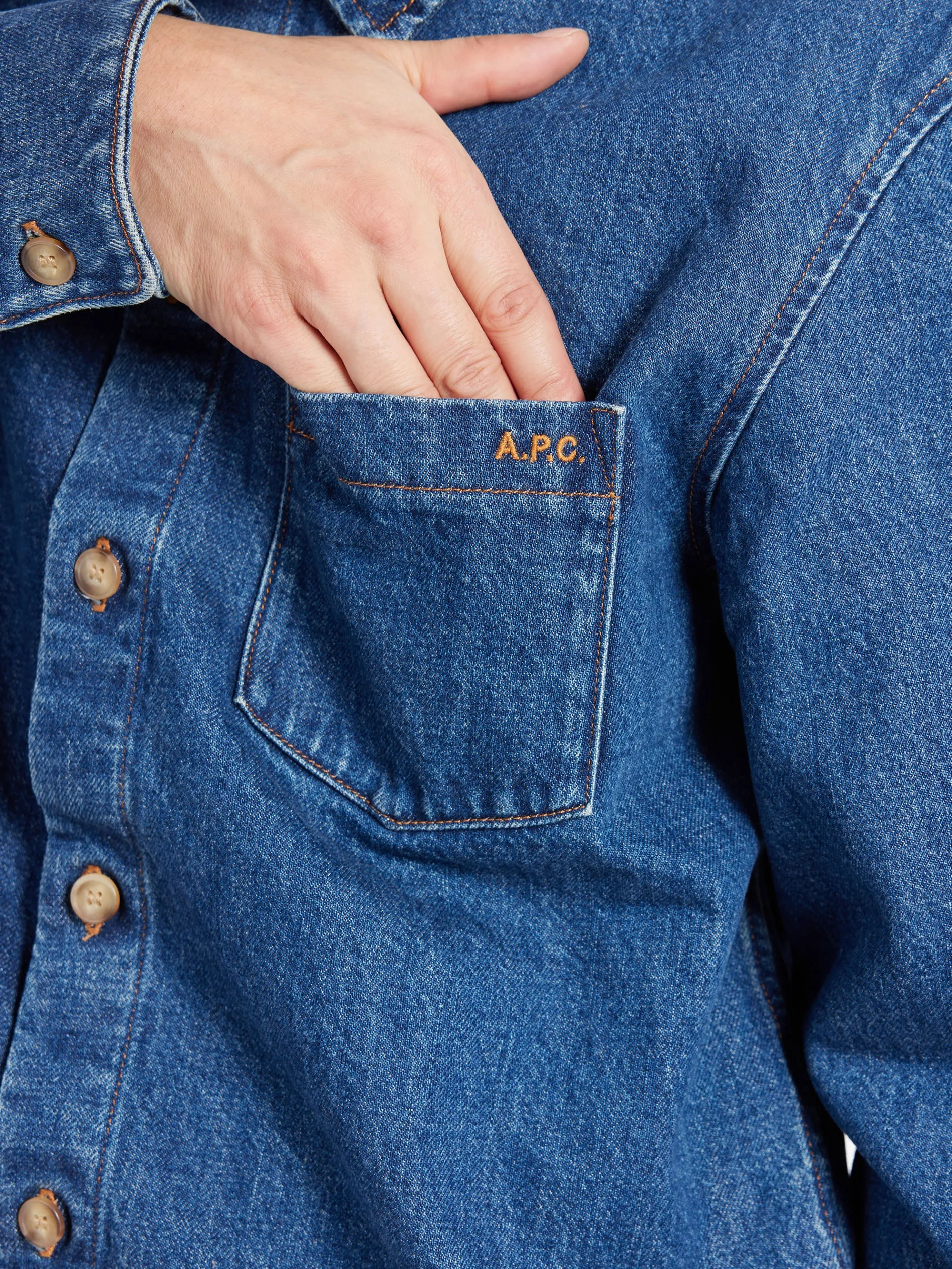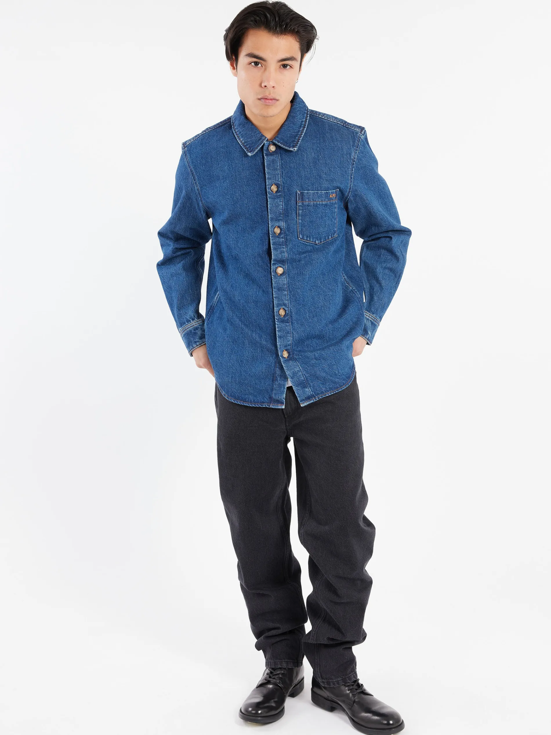 Overshirt in stonewashed indigo Japanese organic cotton denim.