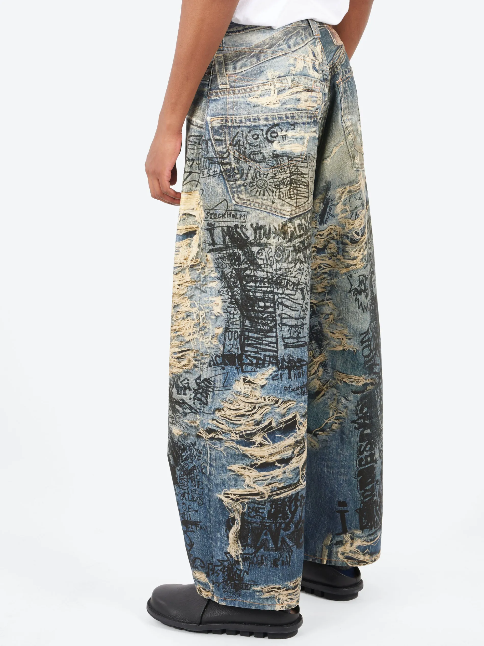 2023 jeans are cut to a super baggy fit with a mid waist, super wide leg and long length. Adorned with a seasonal trompe l’oeil ‘torn scribble’ print, crafted from non-stretch denim with a mineral tint.