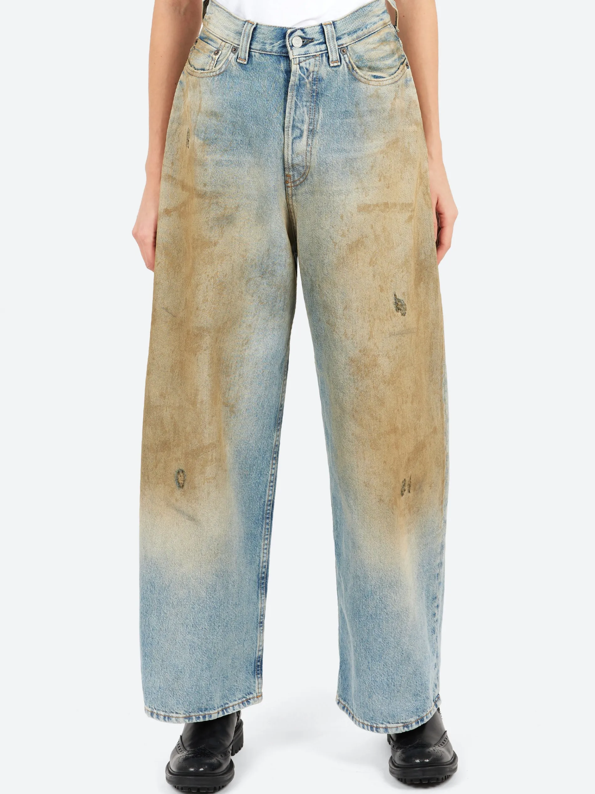 2023 jeans are cut to a super baggy fit with a mid waist, super wide leg and long length. Crafted from non stretch denim in a blue wash with paint and smudge details.