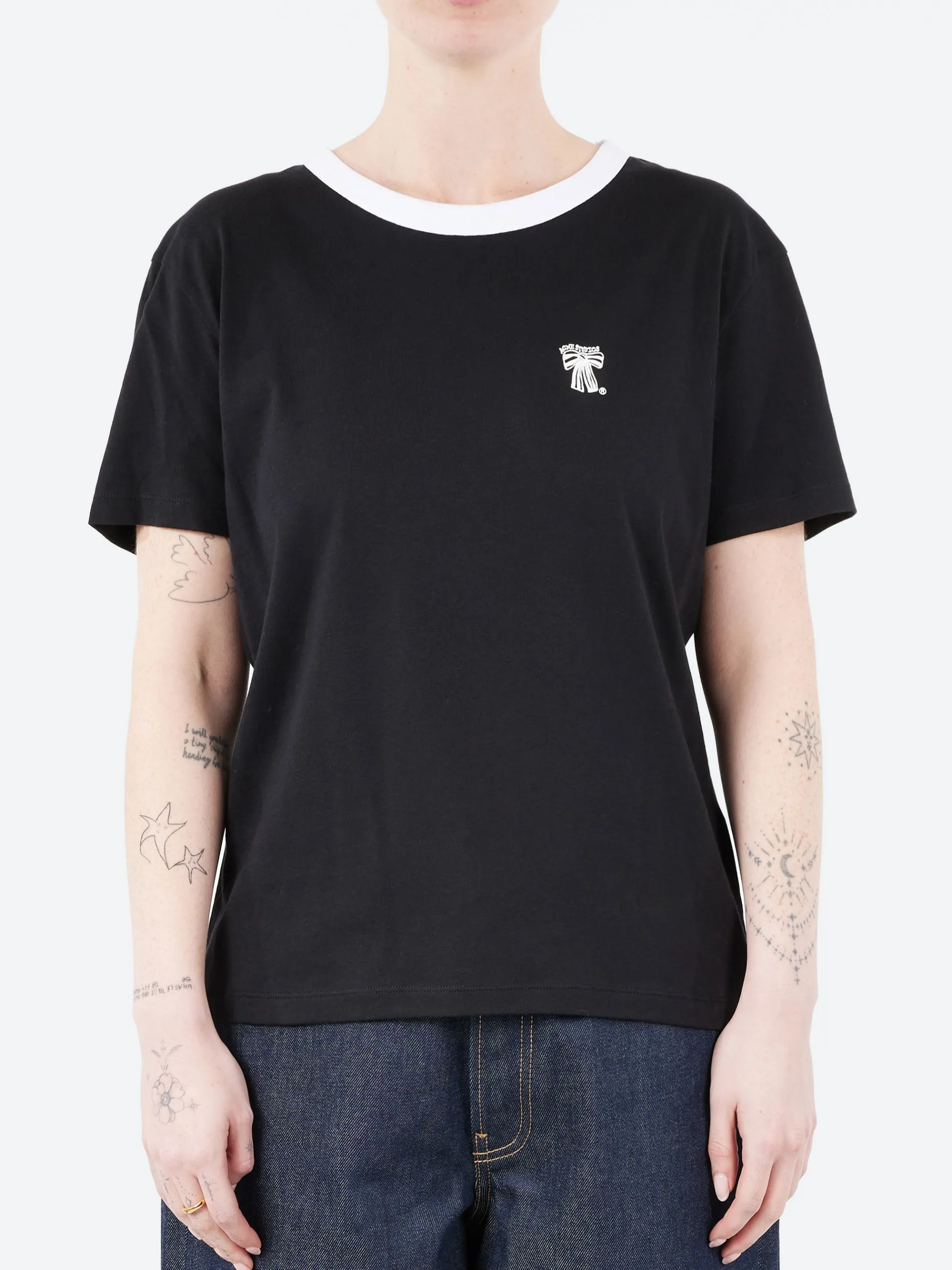 Crew neck t-shirt is crafted lightweight jersey cotton blend. Detailed with a small bow logo at the chest. Cut to a regular unisex fit and hip length.
