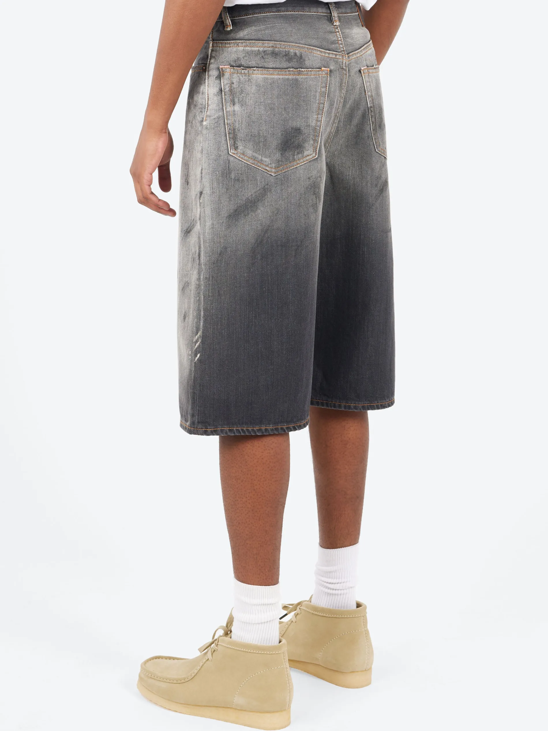 Denim shorts are cut to a loose fit with mid/low waist, straight leg and knee length. Crafted from non-stretch denim in a dark wash with tinted and painted mark detailing.