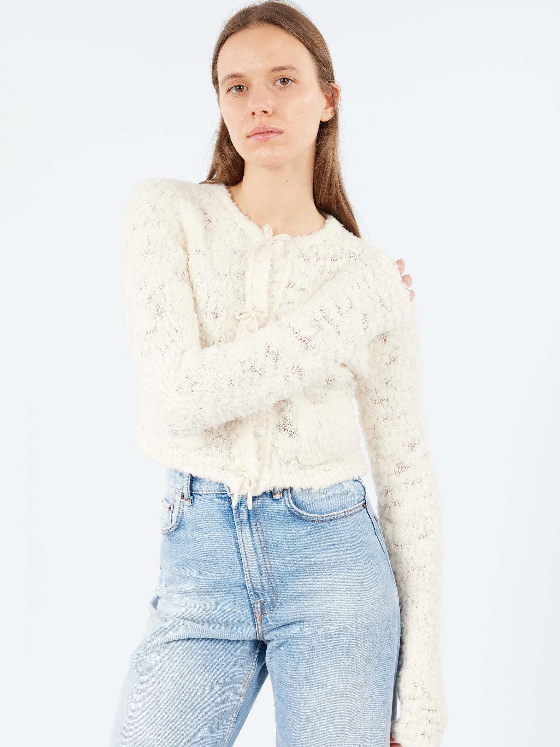 The Acne Studios Bow Wool Cardigan in white is a refined piece that merges Scandinavian minimalism with feminine detailing. Crafted from a soft wool-blend fabric, this cropped cardigan features a delicate bow closure at the front, adding a touch of elegance to its clean silhouette. Its open-knit texture and slightly stretchy material offer both comfort and style, making it a versatile addition to any wardrobe.