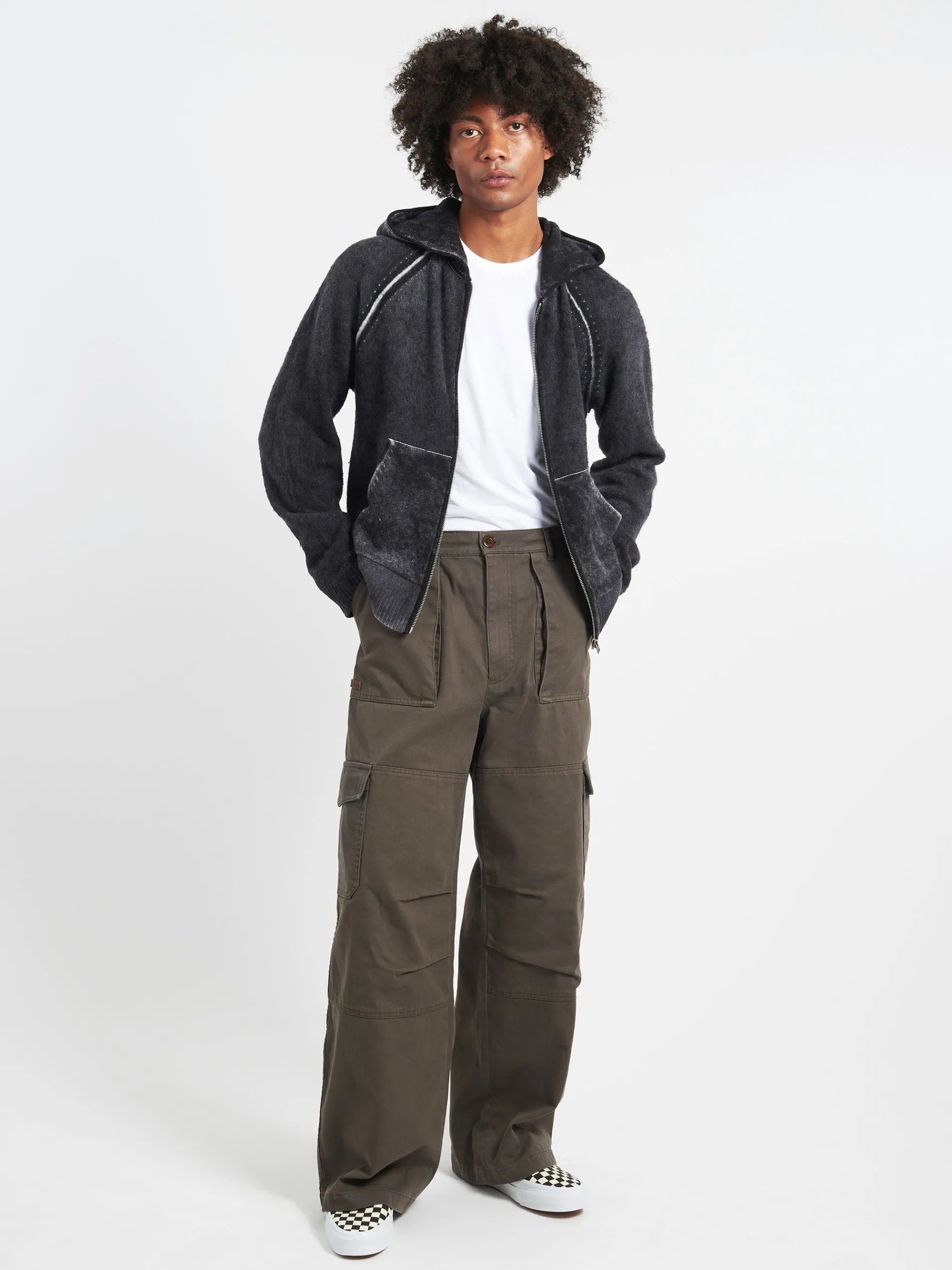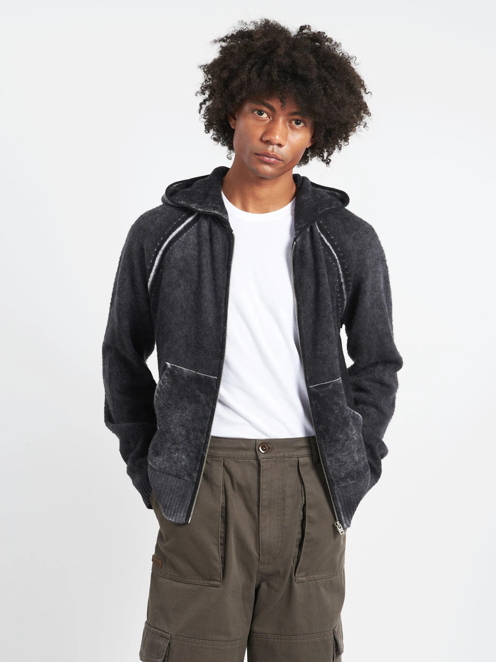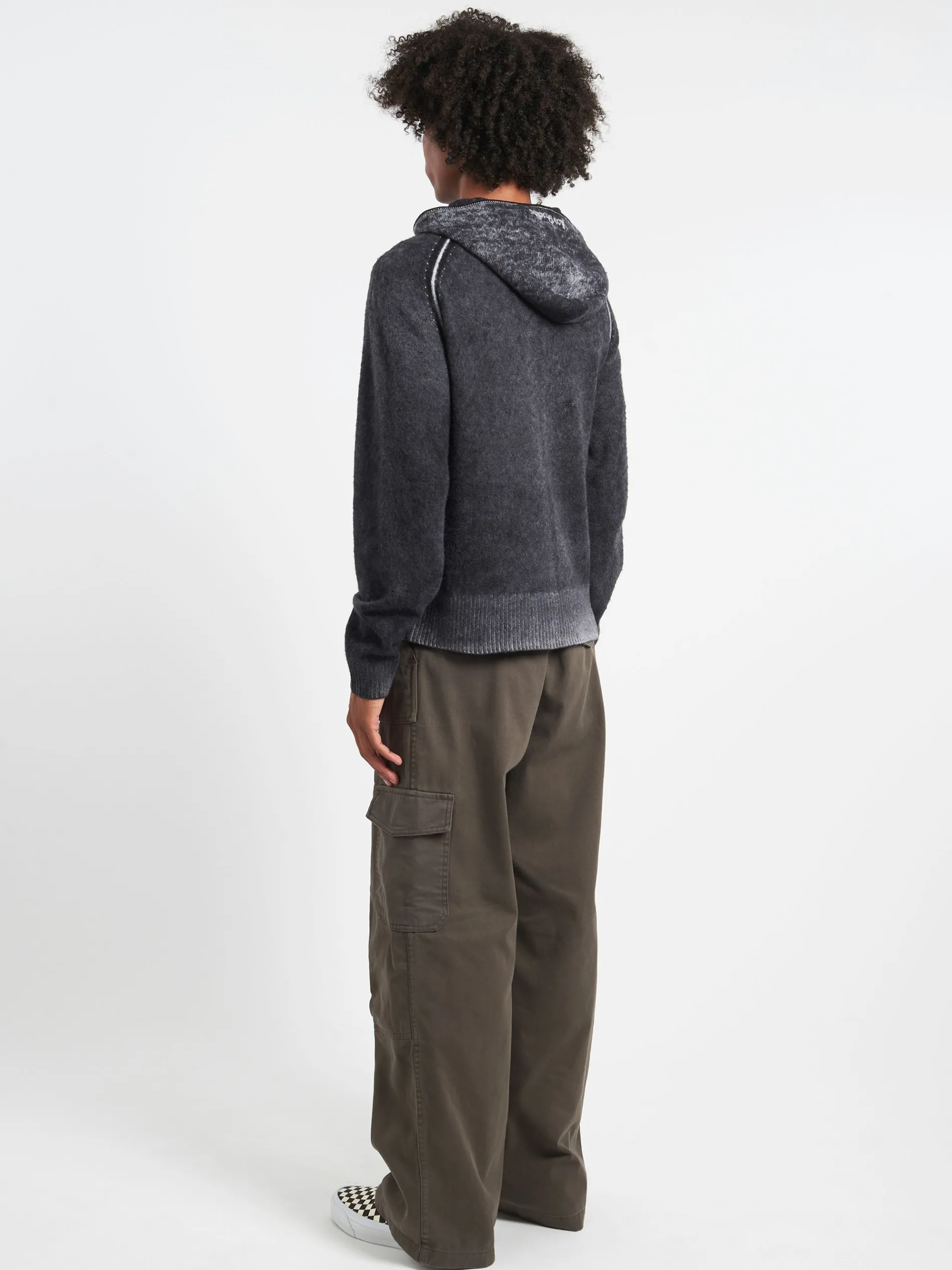 Hooded sweater features an inside print with a vintage finish, crafted from a wool cashmere blend. Detailed with an Acne Studios logo print on the hood.