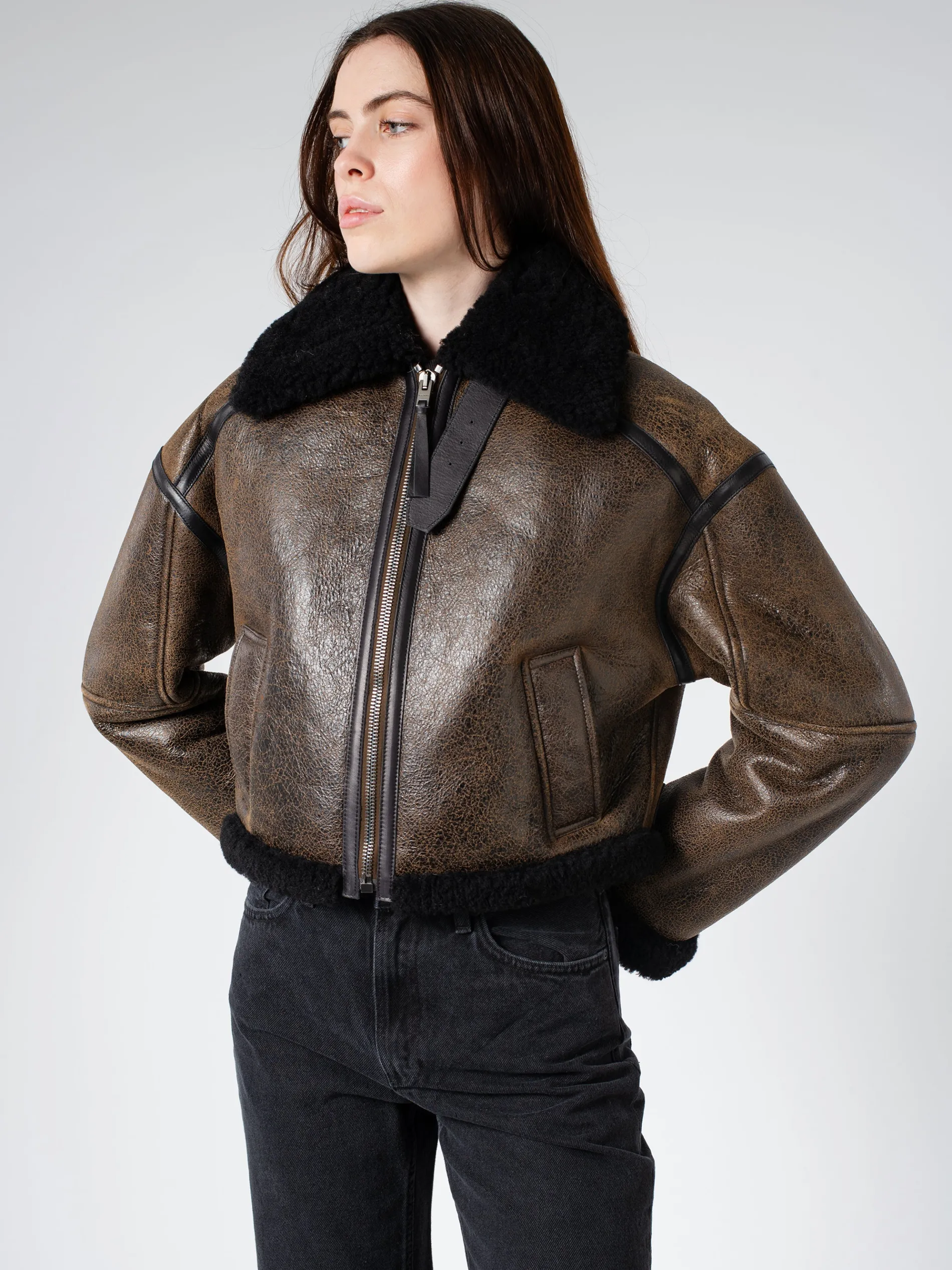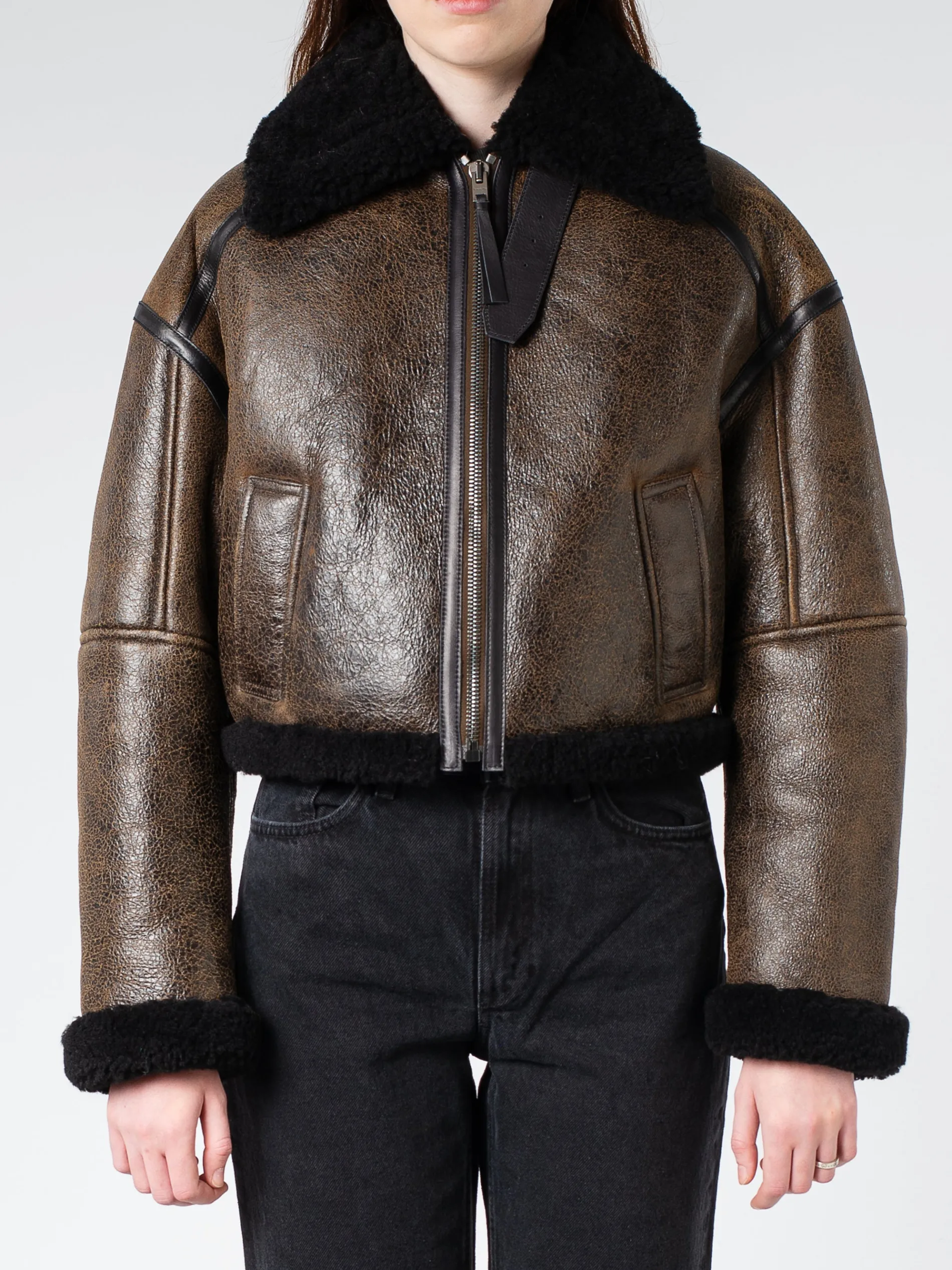 Acne Studios jacket is crafted from merino shearling and crackled finish leather.