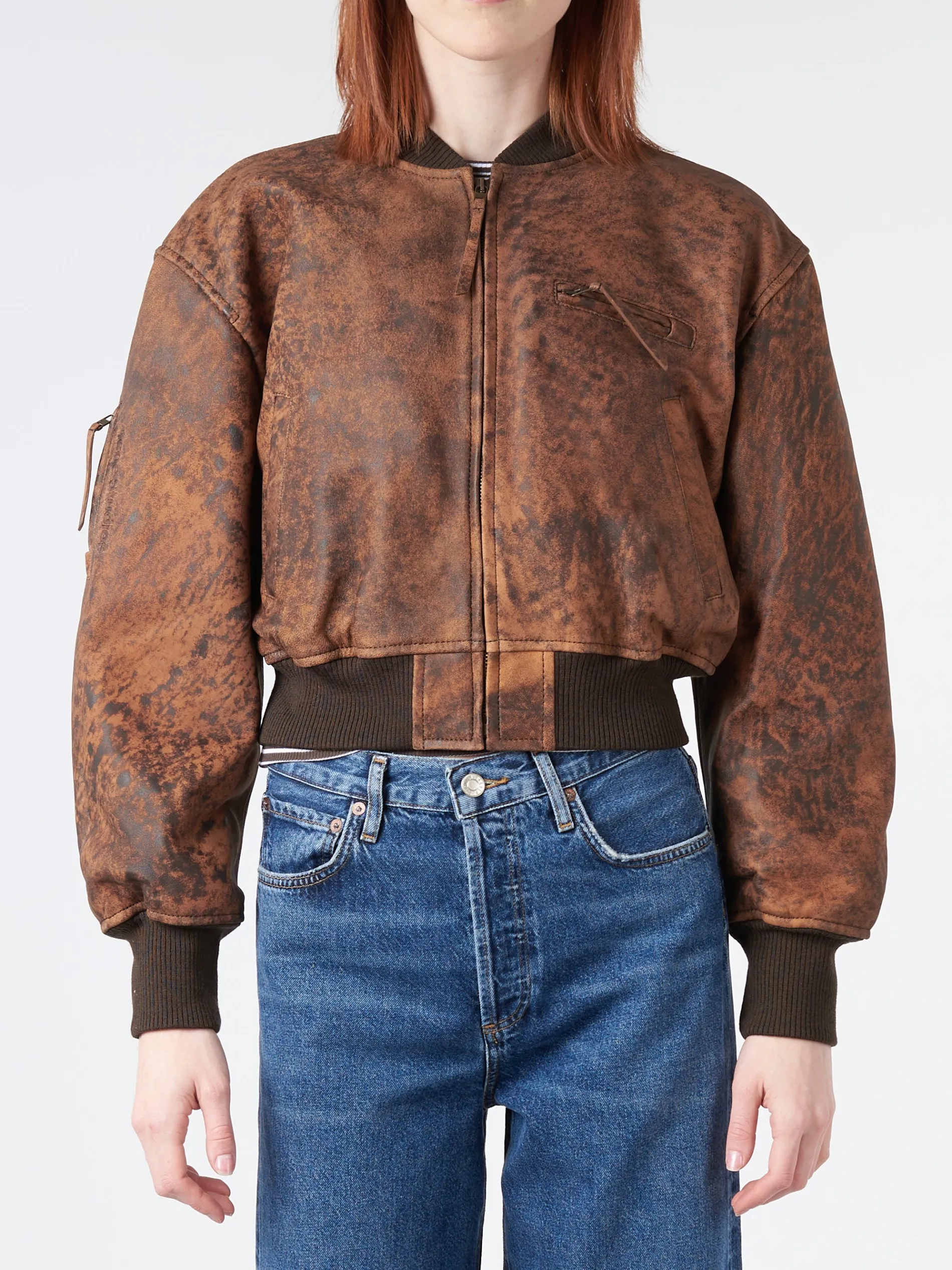 Classic bomber jacket crafted from vegetal tanned leather with a treated finish and internal padding. Complete with ribbed cuffs and hem.