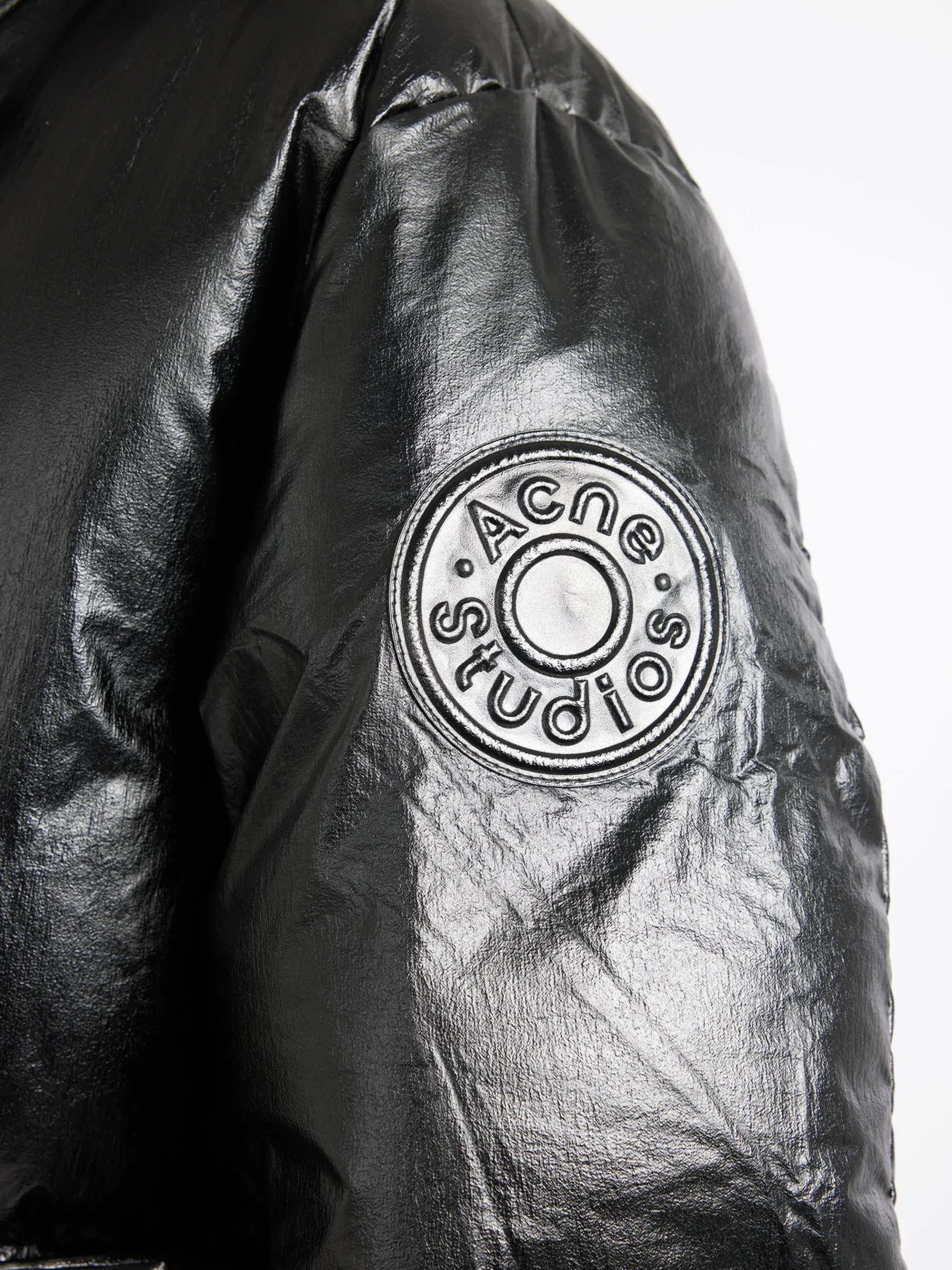 Puffer jacket is crafted from water-repellant nylon with a shiny coated finish, detailed with an Acne Studios logo patch at the sleeve. Cut to a relaxed fit and below hip length.