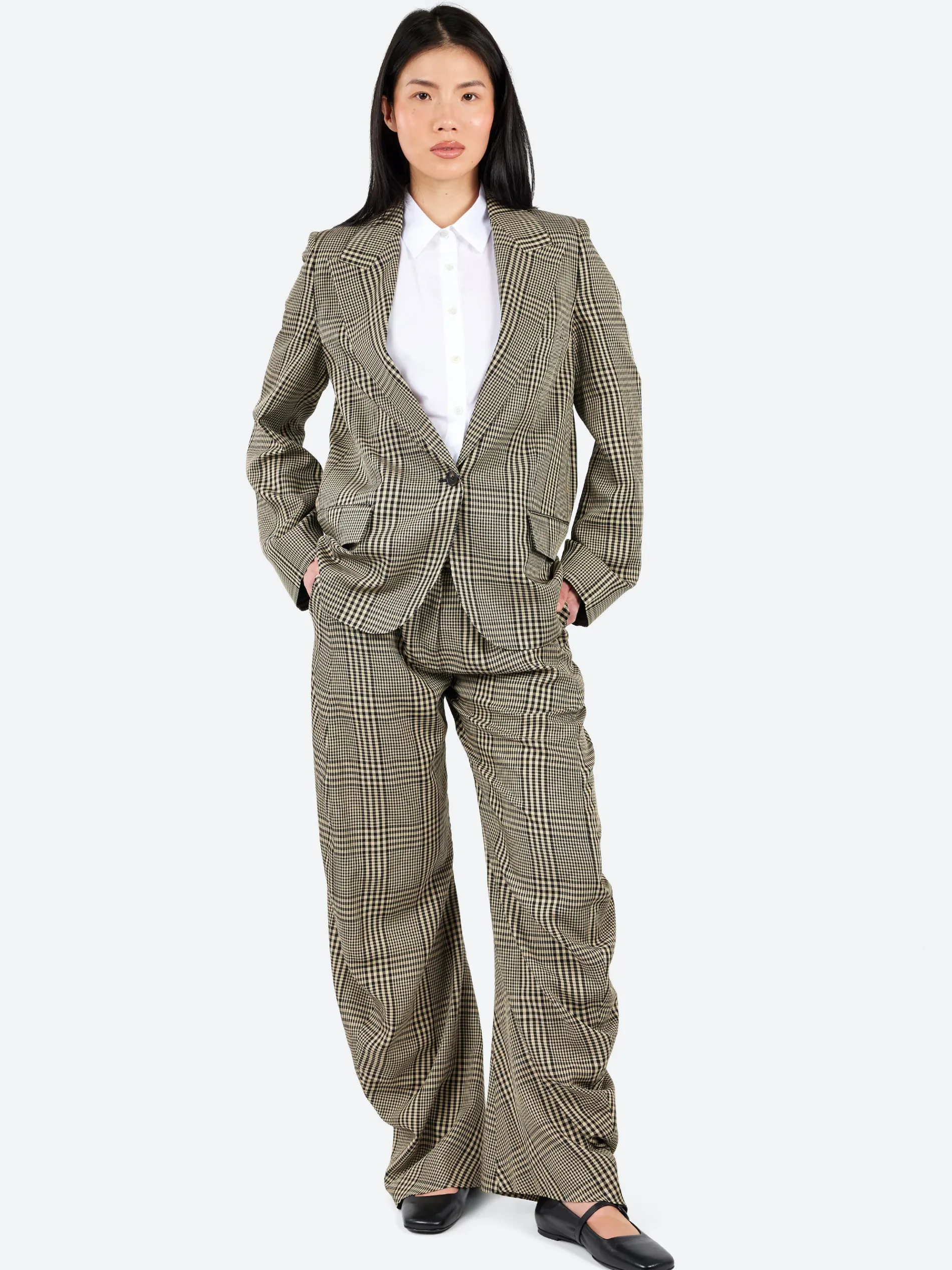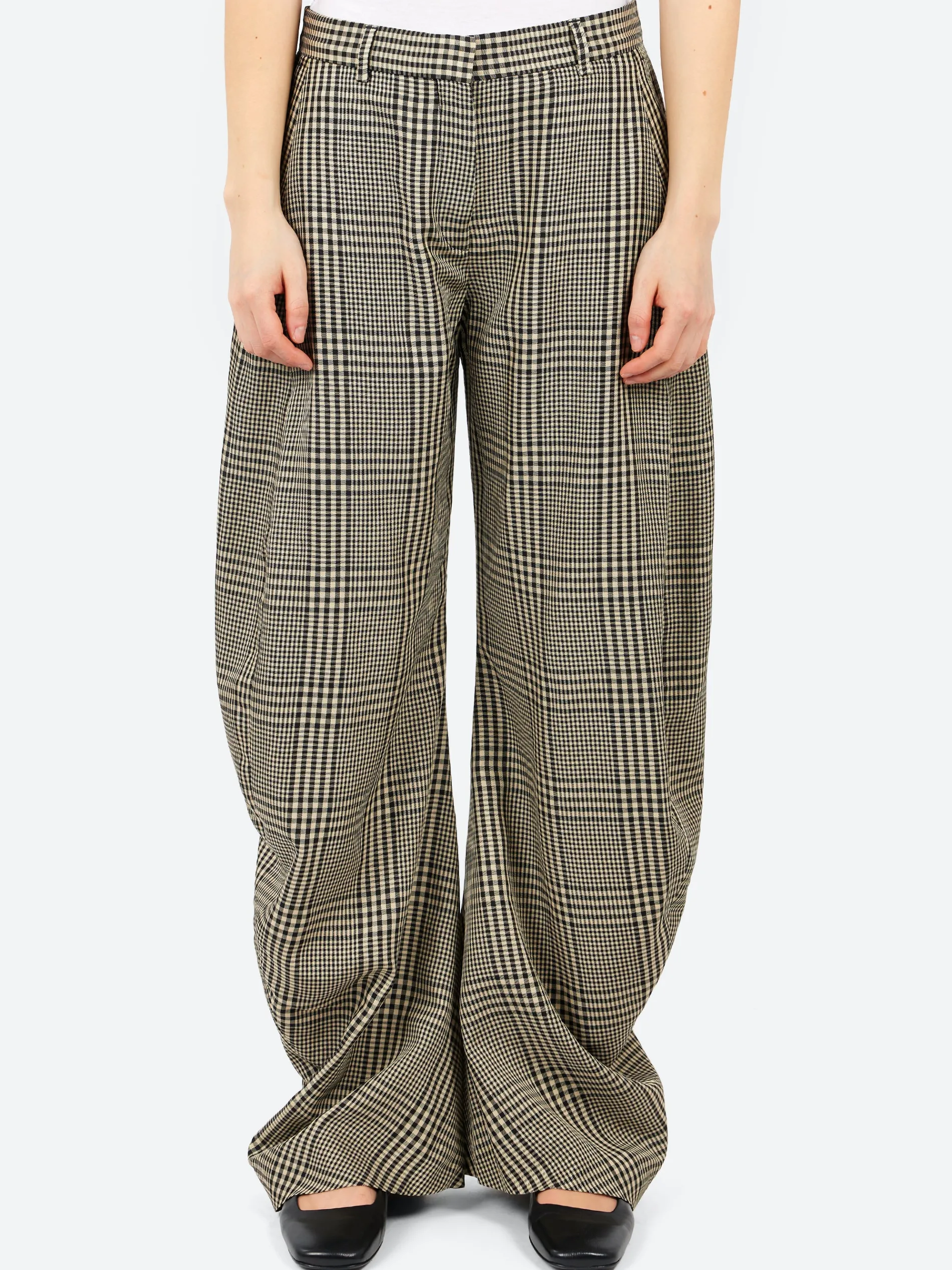 Tailored trousers are crafted from a fluid wool blend, detailed with a seasonal bi-color check pattern. Cut to a regular fit with a mid waist, curved leg and long length.