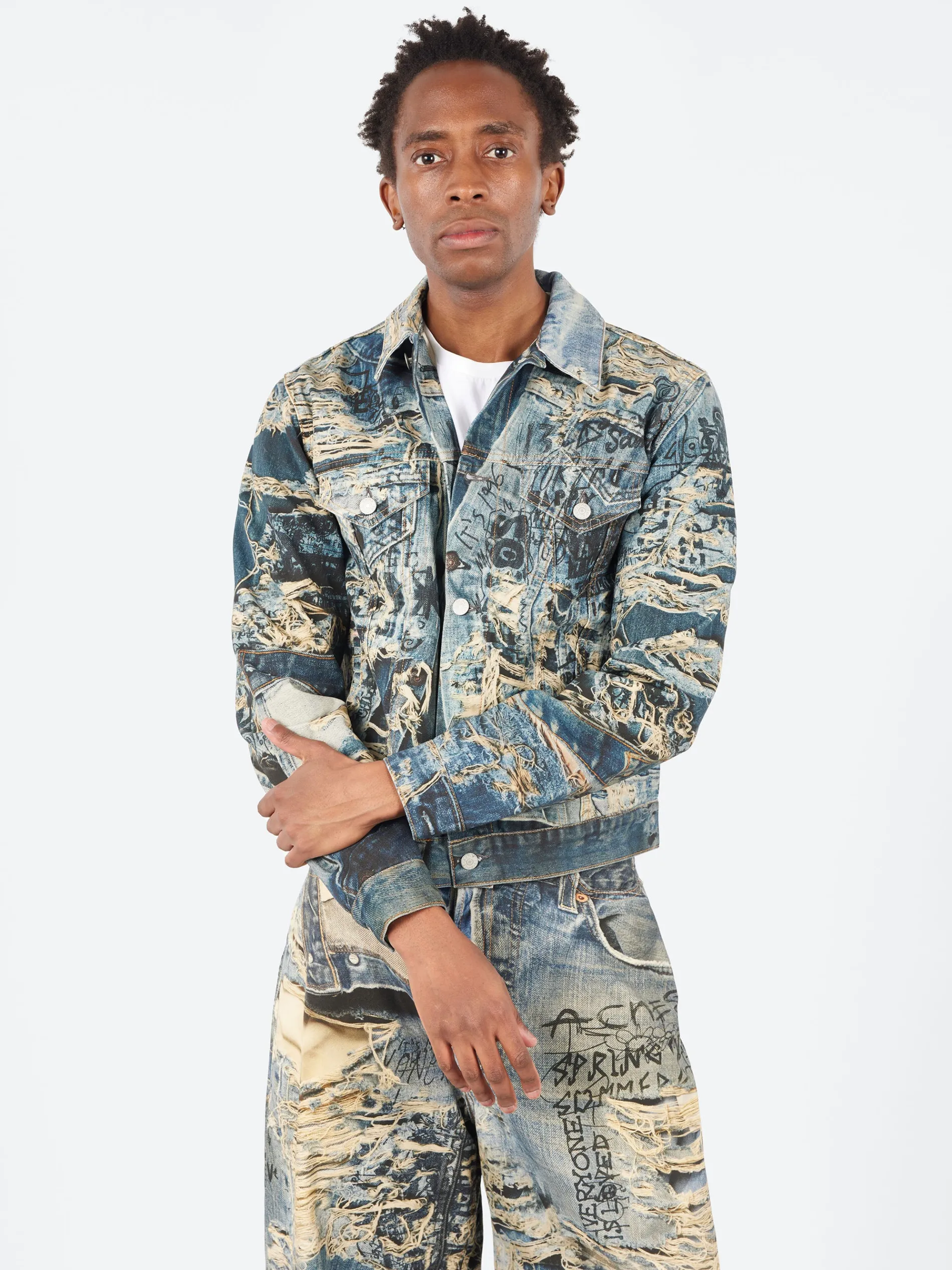Denim jacket adorned with a seasonal trompe l’oeil ‘torn scribble’ print, crafted from non-stretch denim with a mineral tint. Cut to a regular fit and waist length.