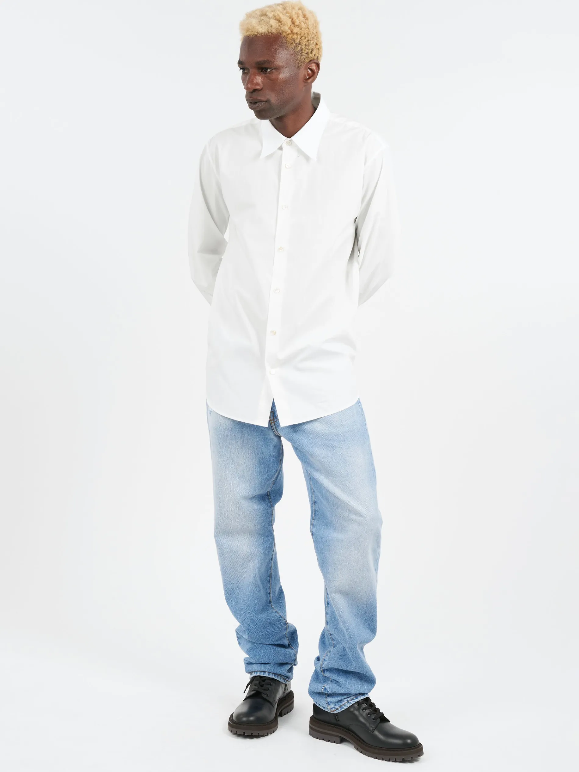 Button-up shirt is crafted from lightweight cotton poplin. Cut to a relaxed fit and below hip length.