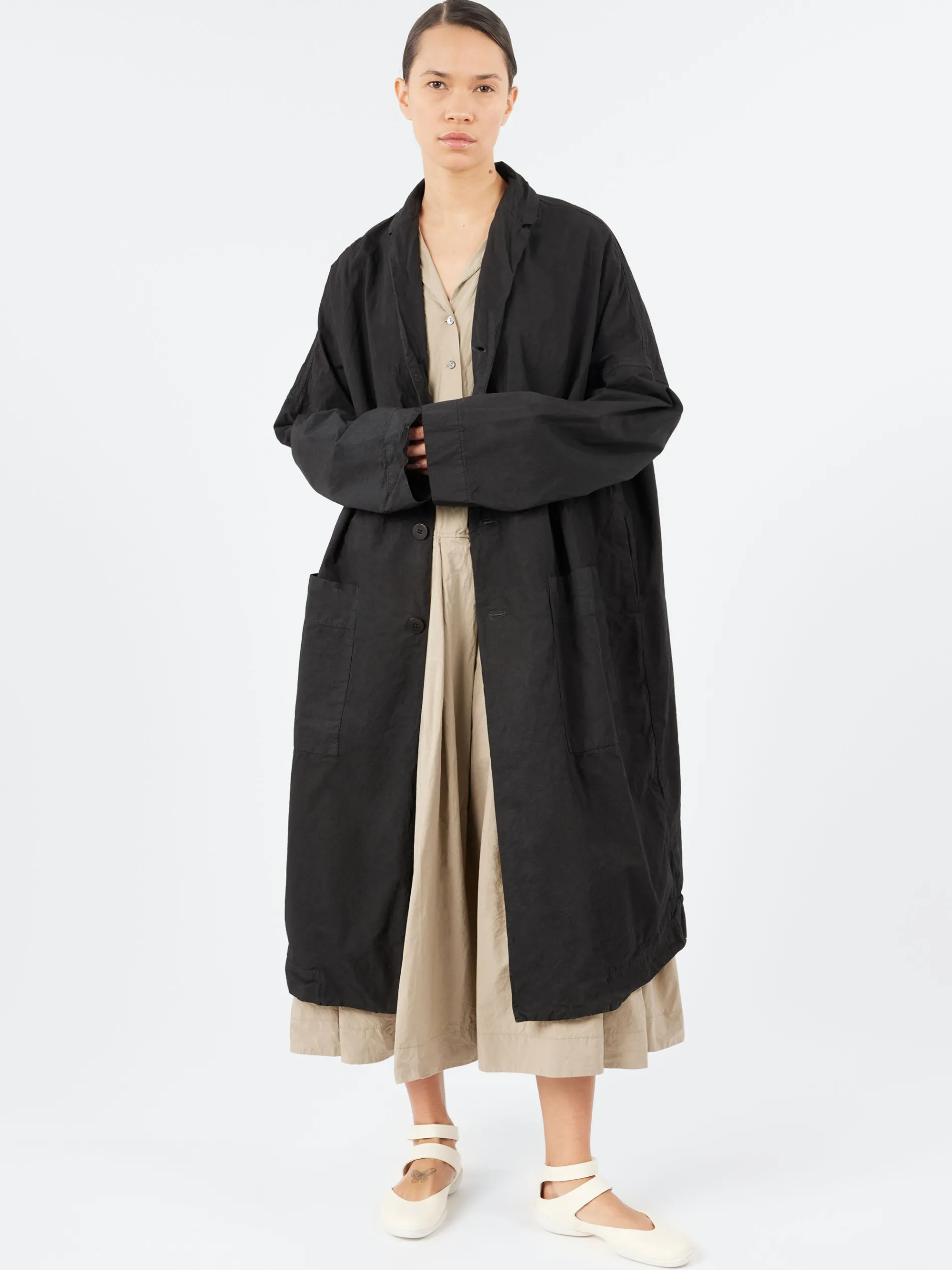 The Album di Famiglia oversized A-line coat is crafted from compact cotton canvas, offering both warmth and texture. It features a small notch collar and large patch pockets, blending practicality with contemporary style. The relaxed, oversized fit adds a chic, effortless laid-back feel. Unlined for breathability, this coat is an ideal choice for layering in warmer weather, providing a lightweight, breathable option without sacrificing style.