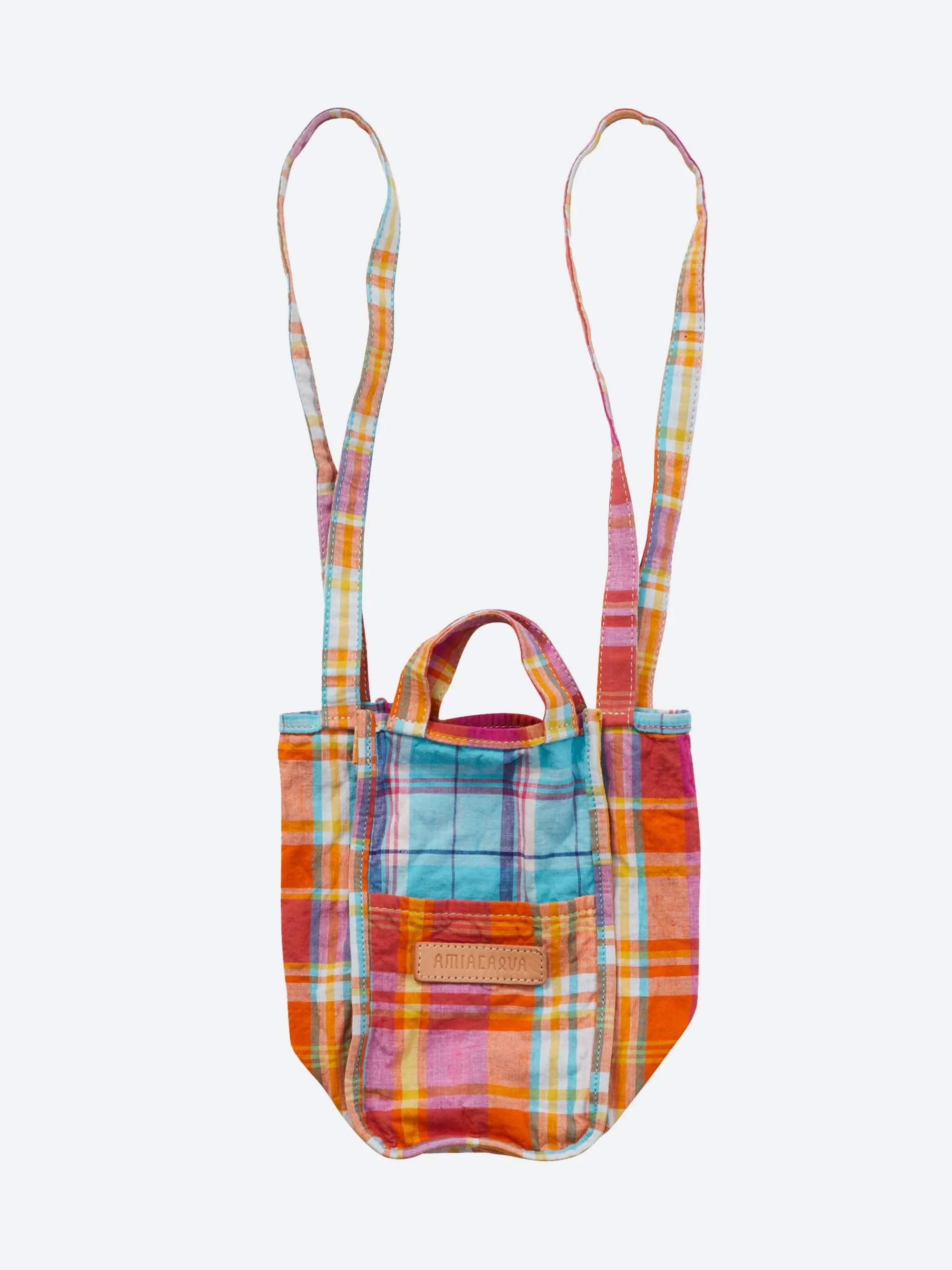 Amiacalva multi-coloured plaid tote bag with four handles, made from printed cotton canvas.