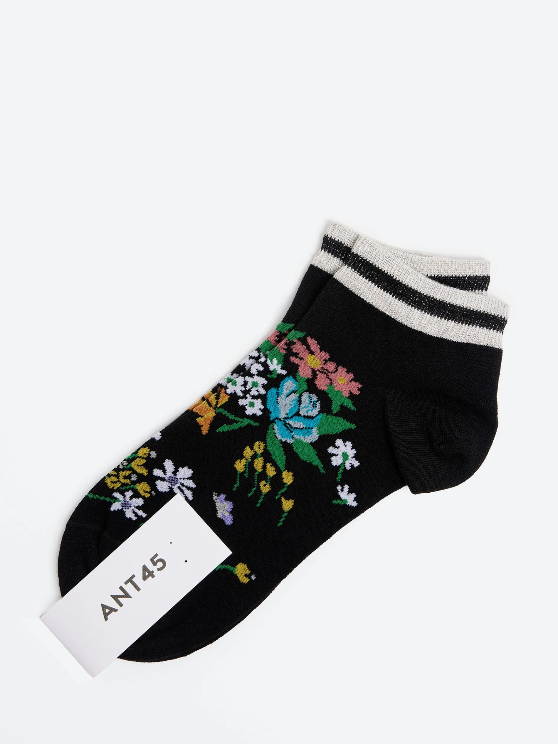 The ANT45 Lihue are short cotton socks featuring a floral pattern complemented by a lurex-accented cuff. Crafted in Italy, these socks offer both style and comfort.