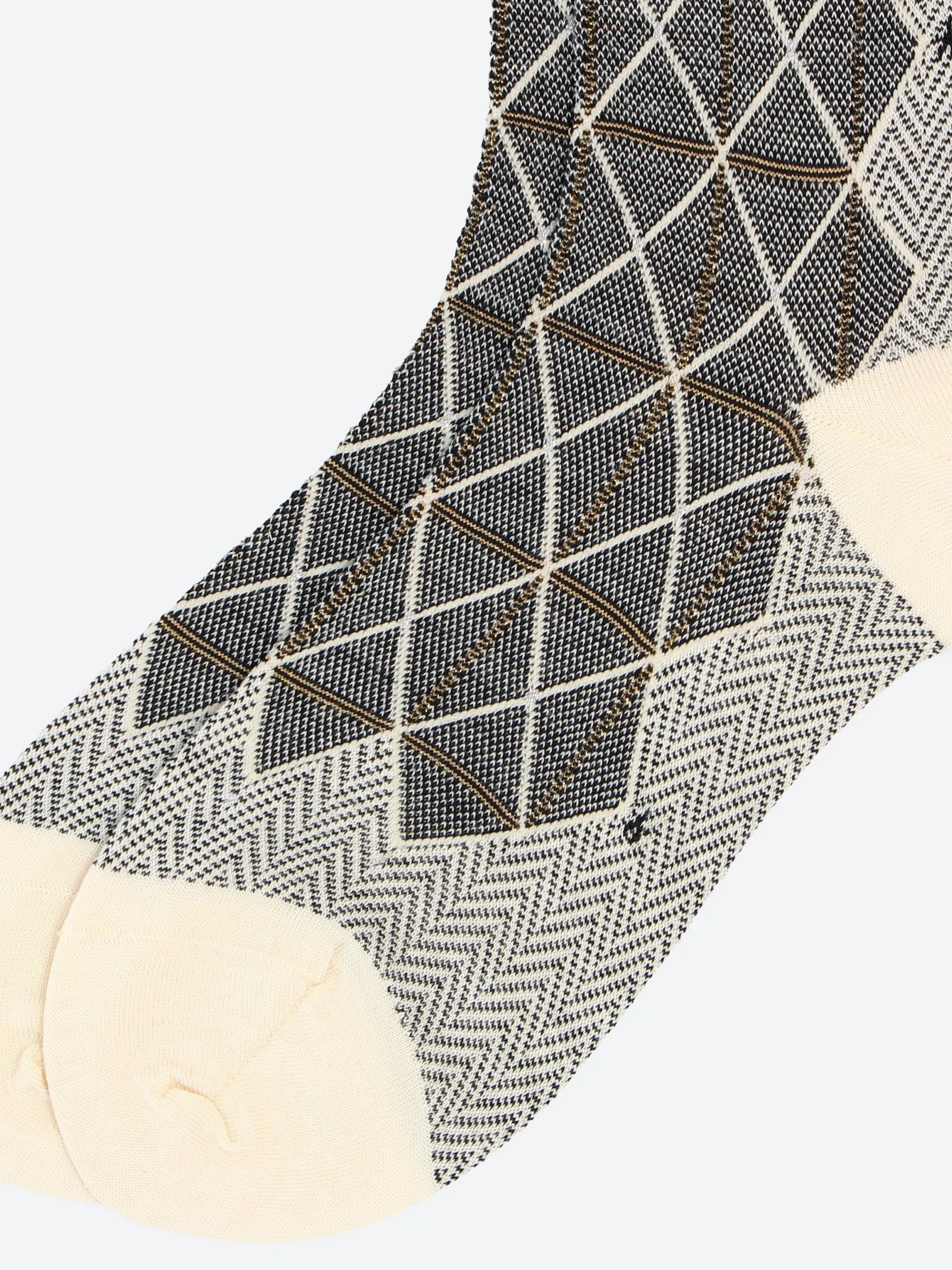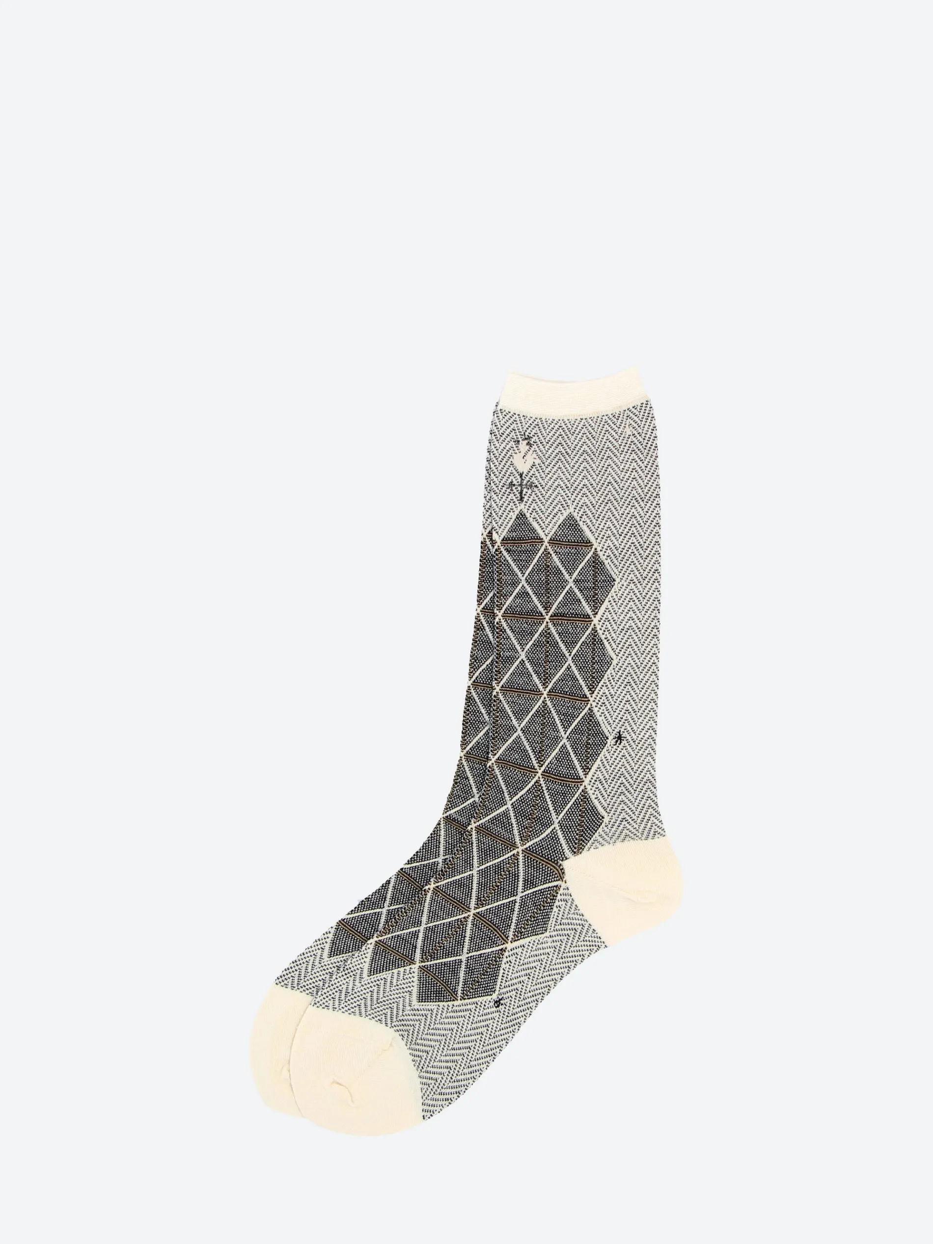 Antipast crew length socks knitted in a fine gauge blend with a plaid and herringbone pattern.