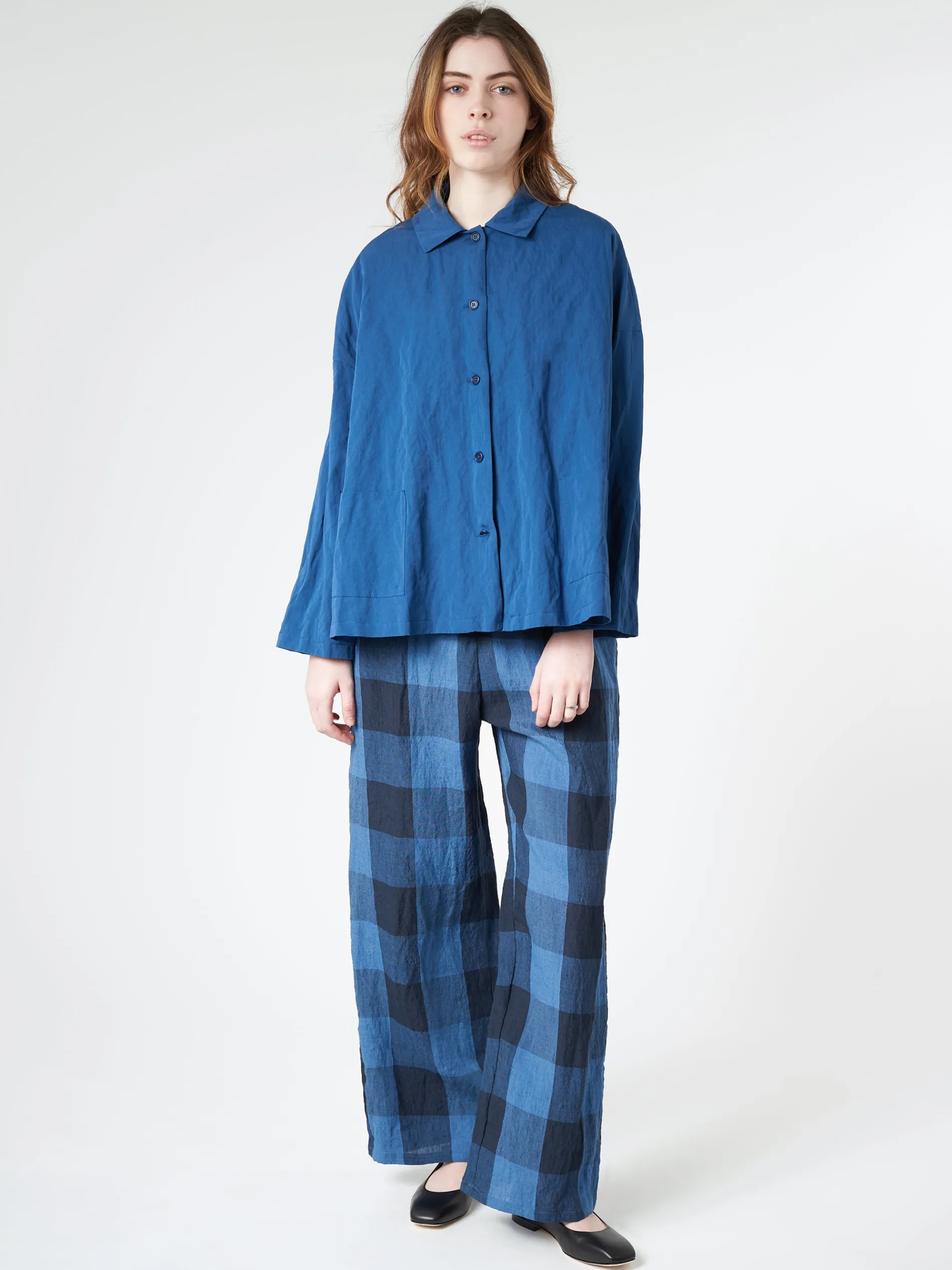 This jacket is designed with a regular fit and features a classic collar, five buttons, and patch pockets. It is crafted from a lightweight and breathable cotton fabric, with the addition of metal for a unique and textural element.