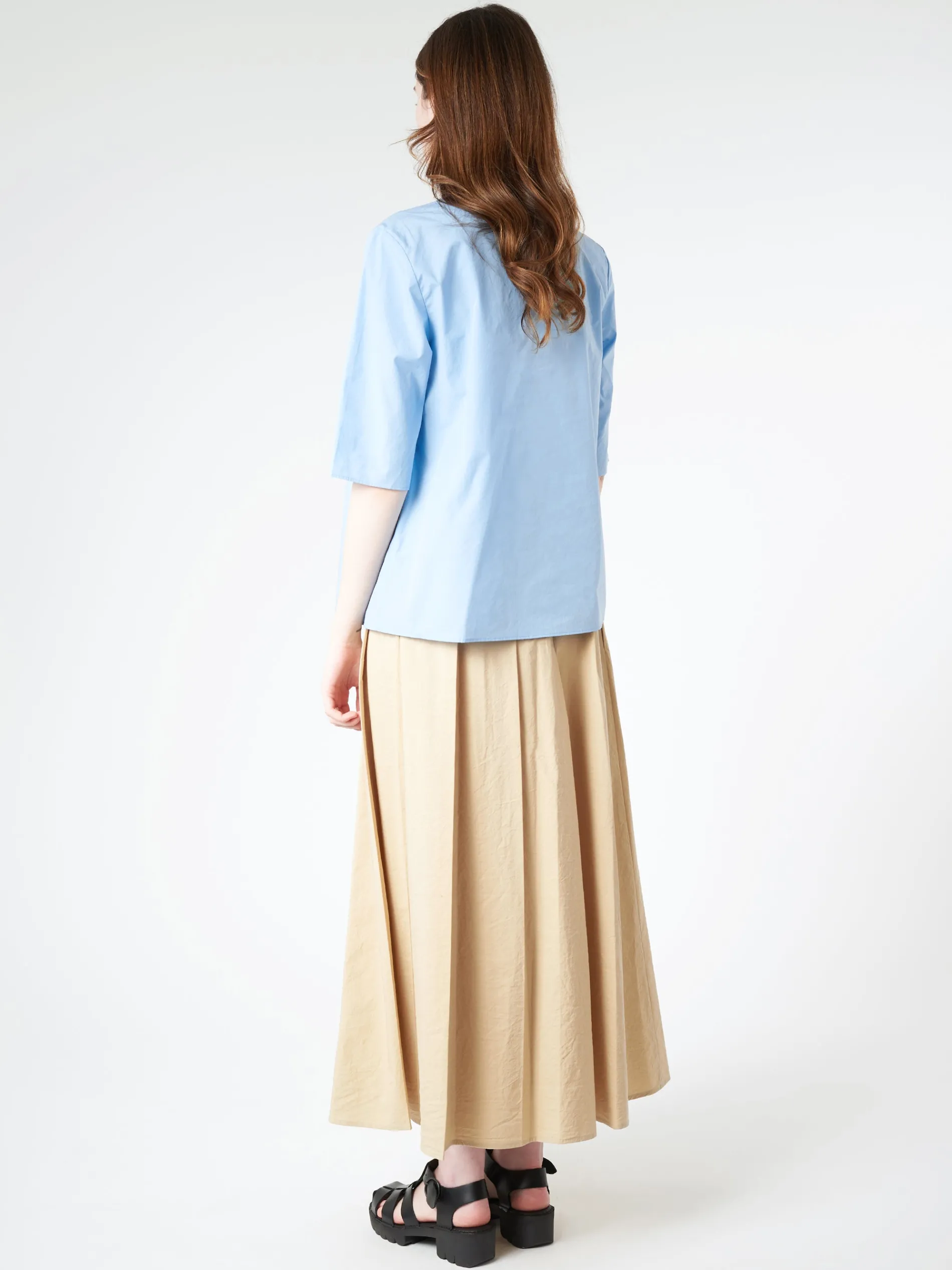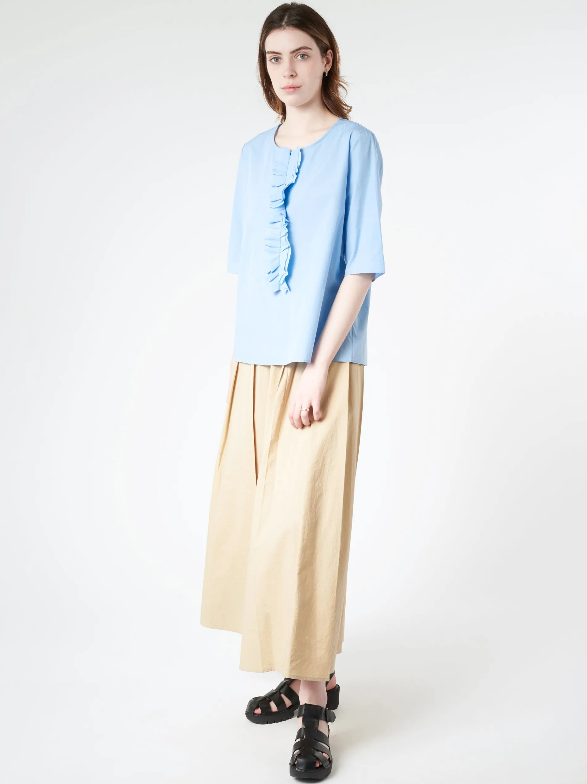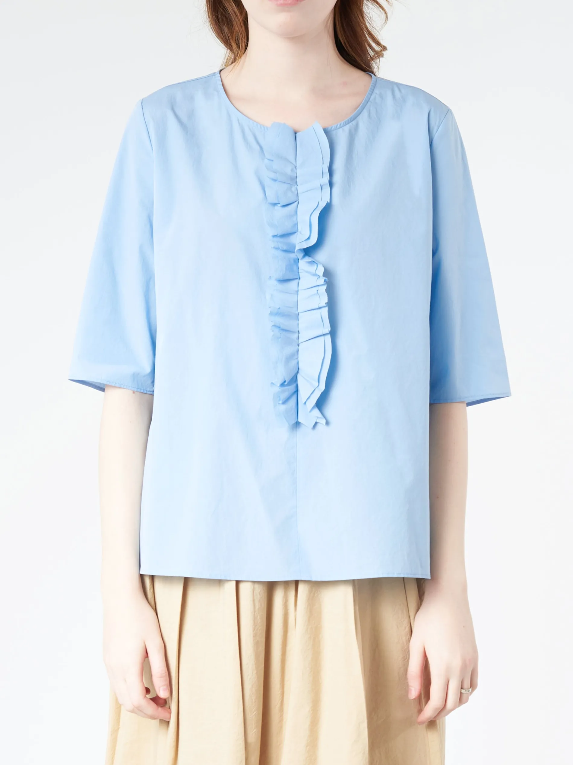 ApuntoB short sleeve blouse with a ruffle trim made from lightweight cotton poplin.