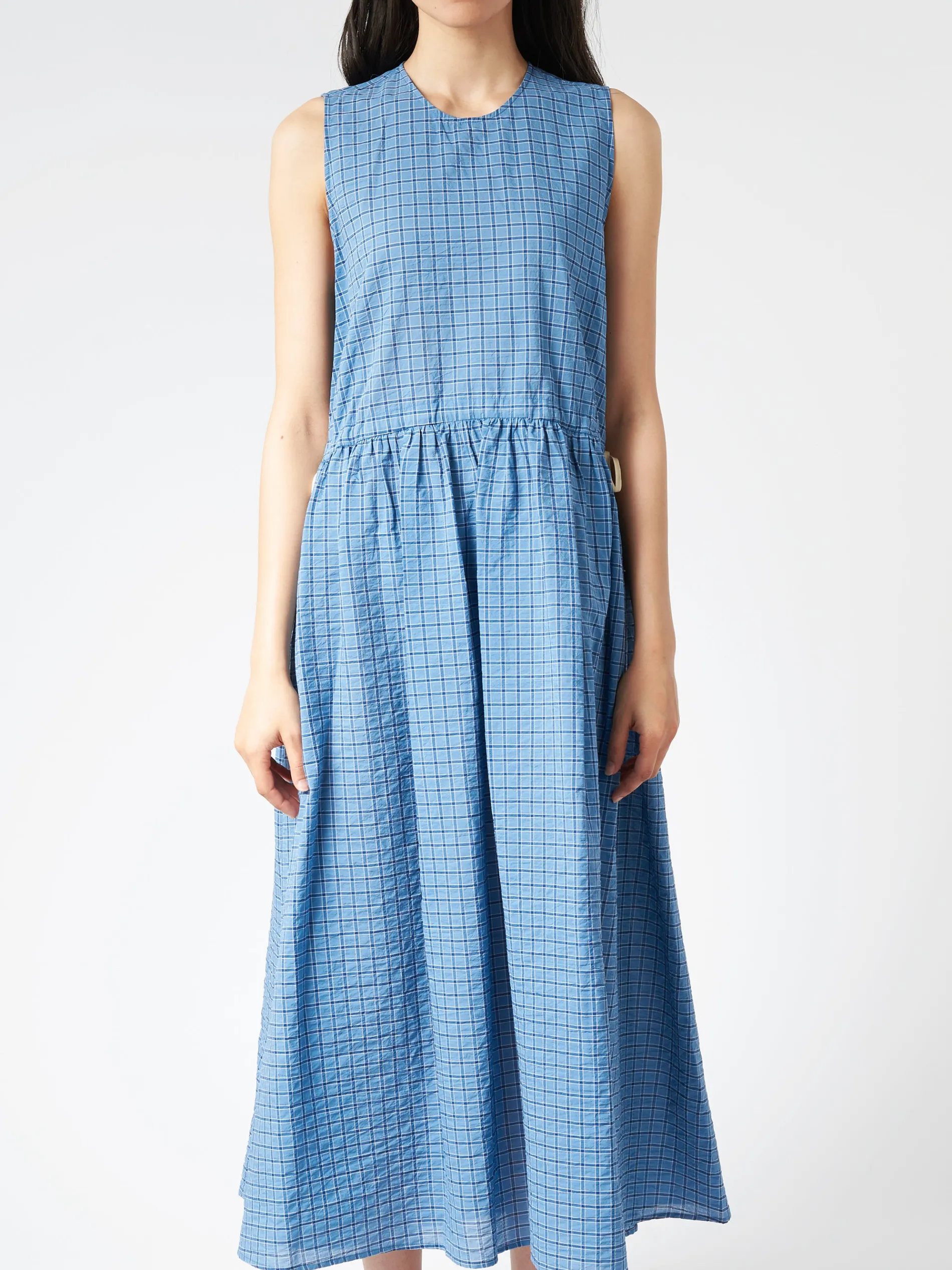 Oversized sleeveless dress with a gathered skirt, with an inner drawstring to cinch the waist.