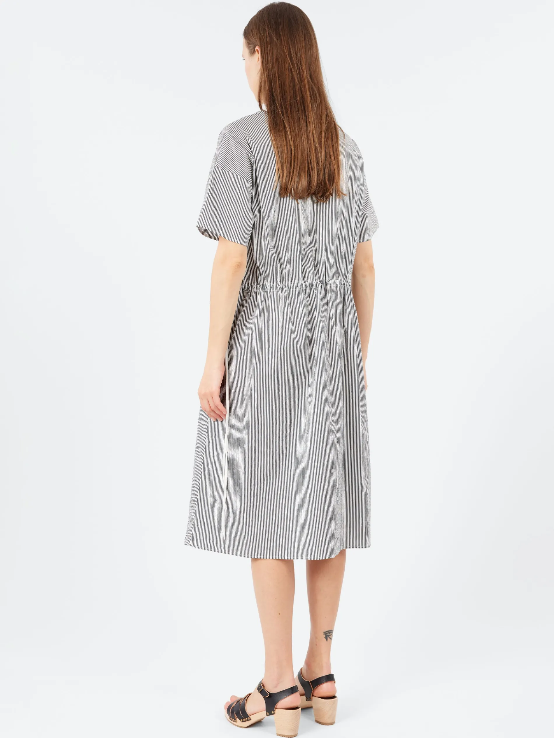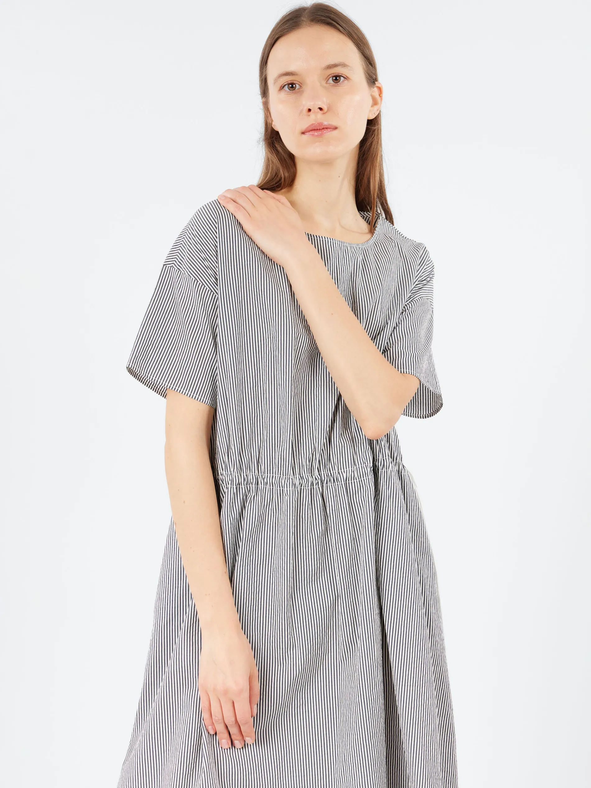 This Italian-made dress from ApuntoB features a clean, minimalist design in a versatile tone. Crafted from cotton and silk, it includes a round collar, short sleeves, and an elastic waistband for a subtly cinched silhouette. The relaxed A-line shape and thoughtful detailing make it an easy, elegant choice for everyday wear.
