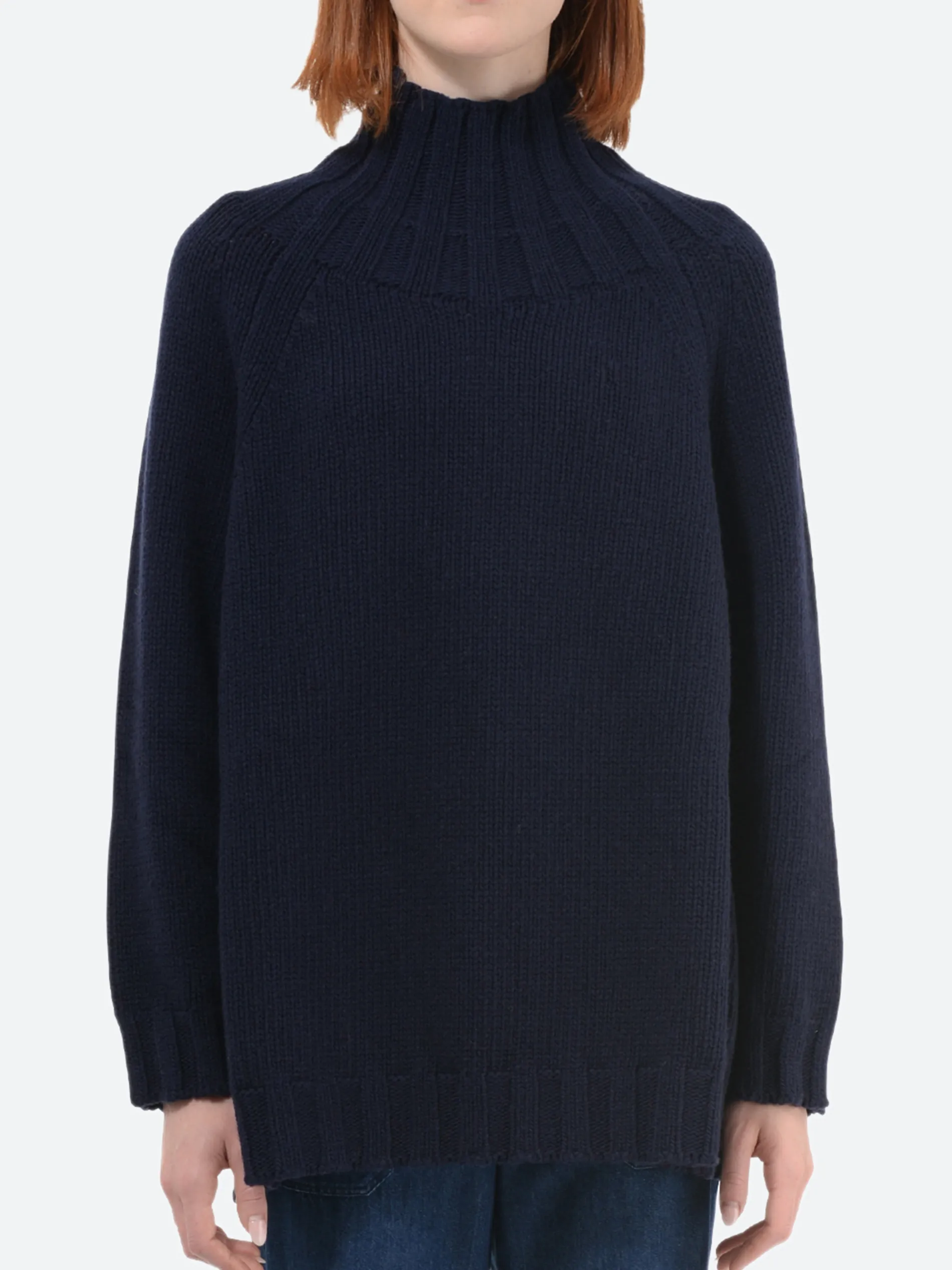 Stockinette stitch with ribbed chimney collar in 5-gauge merino wool yarn.