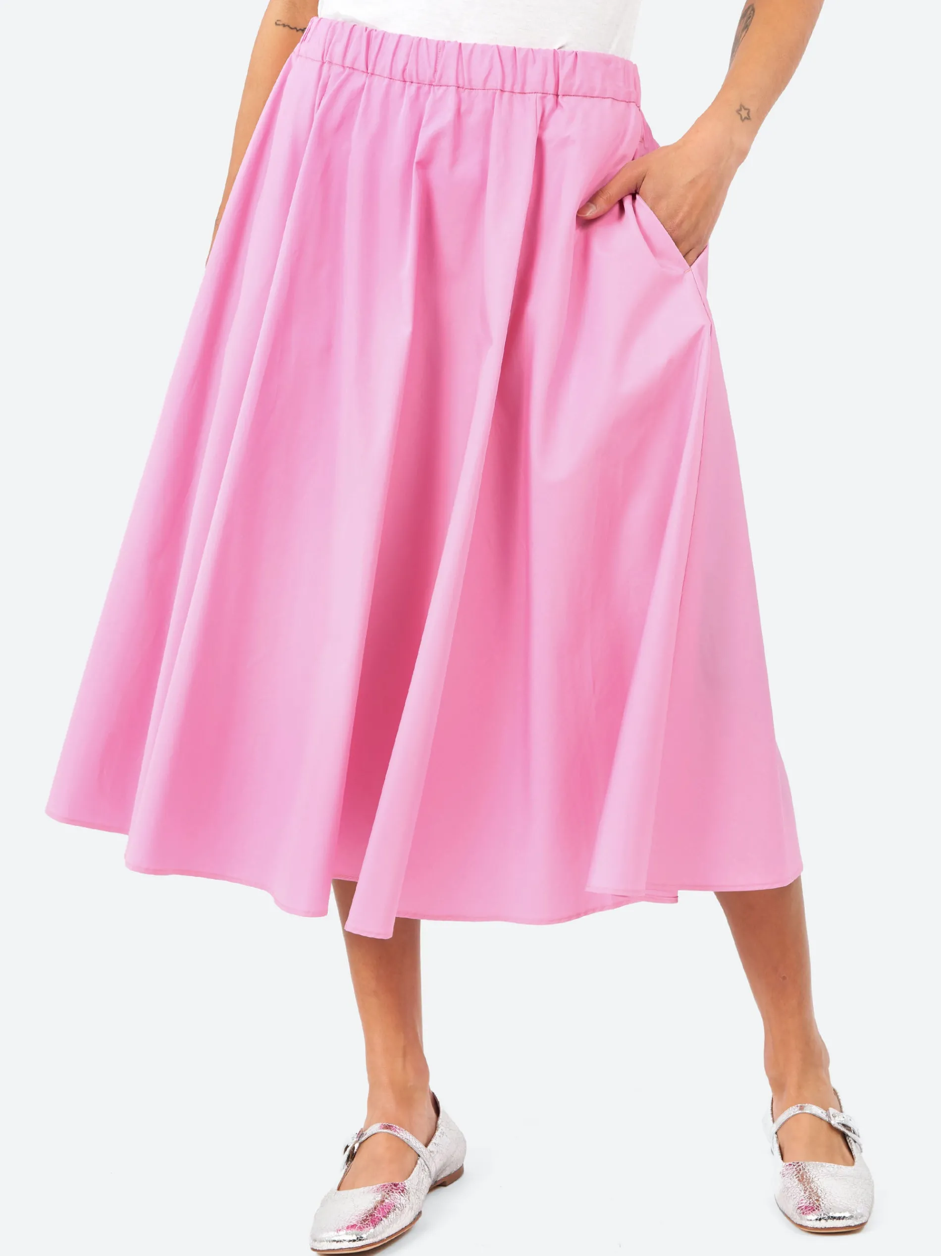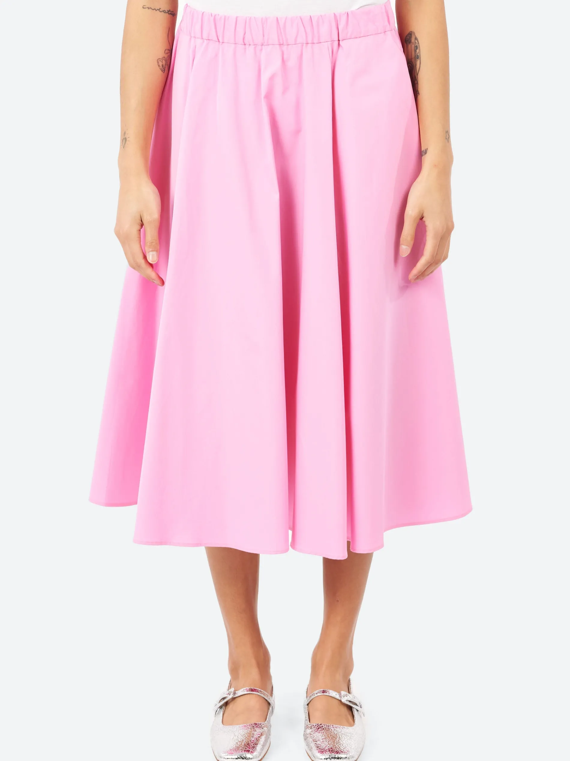 This cotton poplin skirt by Aspesi is unlined and features a flared silhouette for a feminine, effortless look. It is designed with a comfortable stretch waistband and inset side pockets for added practicality. The skirt offers a regular fit, making it a versatile and stylish addition to any wardrobe.