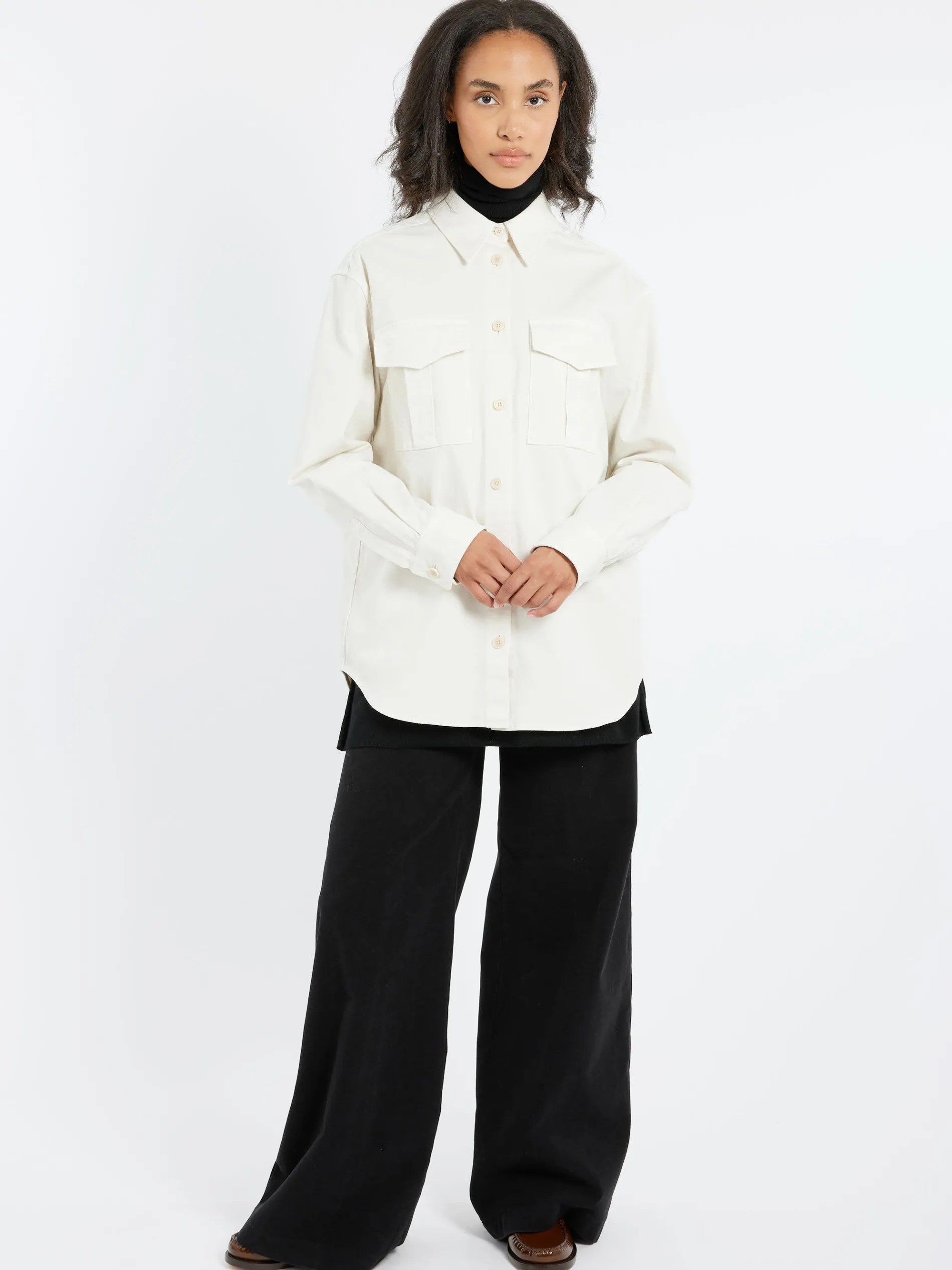 A loose-fitting shirt made from garment-dyed stretch cotton gabardine, a compact fabric with a thick feel.