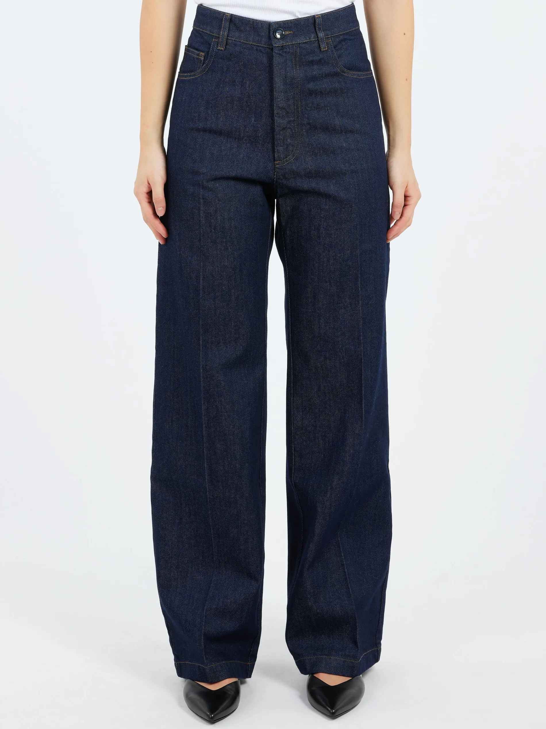 Featuring a full length and wide leg, these straight-cut trousers are crafted from navy cotton denim. For a tailored and fresh silhouette, the Barone trousers are enriched by central front and back crease.
