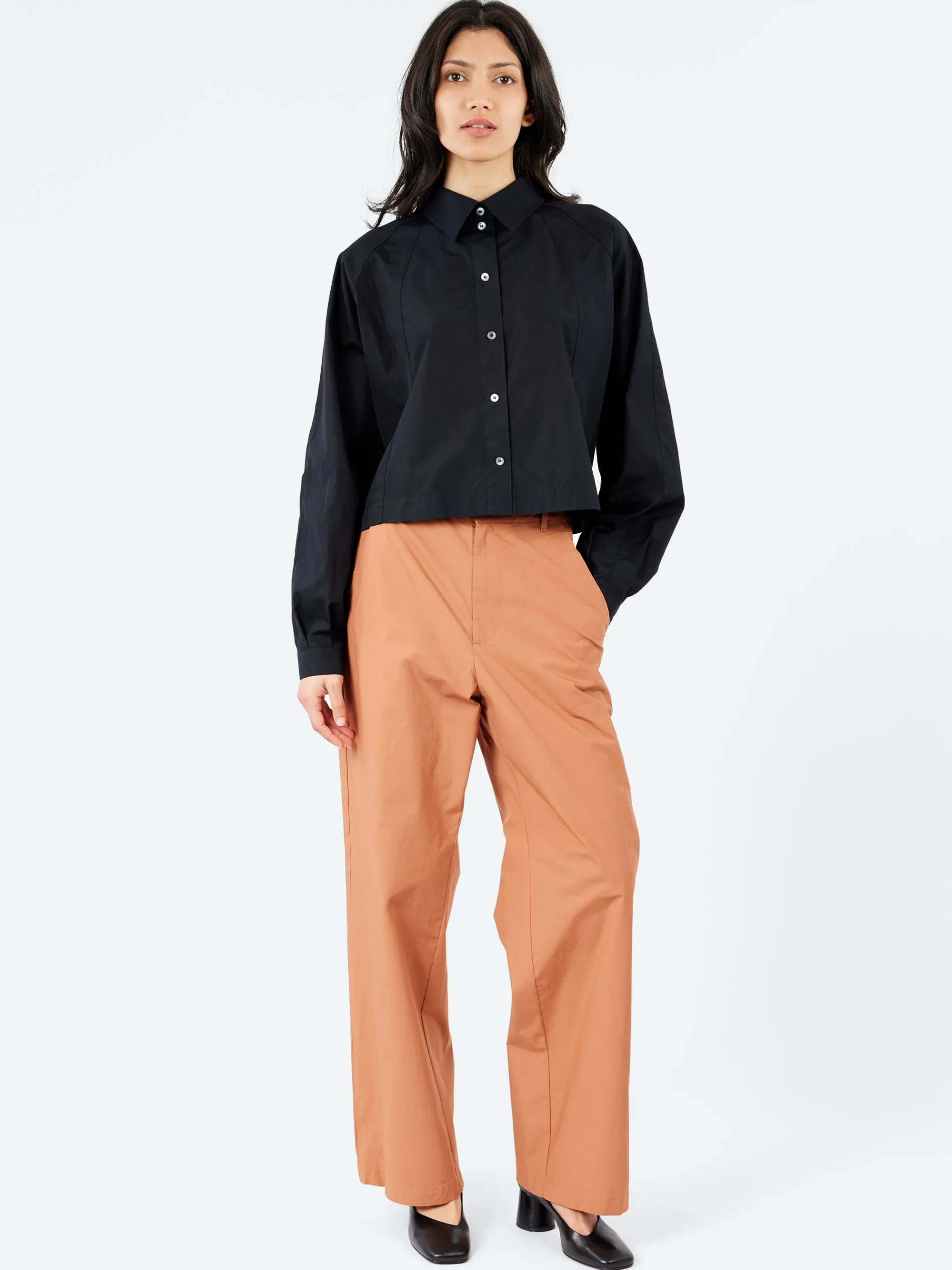 The lightweight parachute stretch poplin, adds a bold and contemporary edge to these trousers, which have become a timeless piece for Barena womenswear season after season. Strict lines and a minimalist design are paired with a relaxed-fit silhouette and an elastic waistband at the back, ensuring both comfort and functionality.