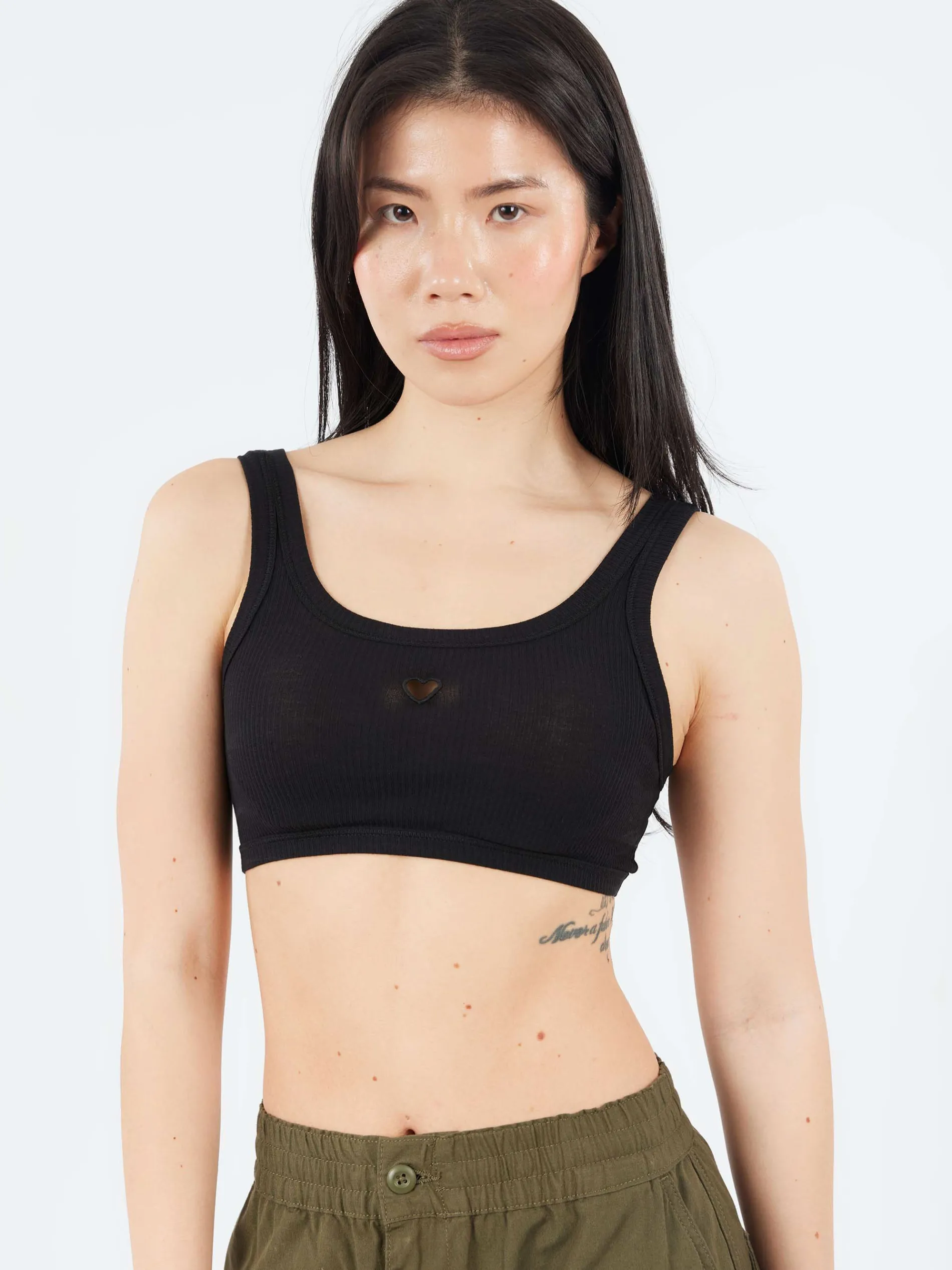 A soft, eco-friendly organic cotton rib bra with heart-shaped embroidery, a front cut-out, and a scoop neckline. Features elastic trim at the neckline and hem, made from cotton for a natural, sustainable touch.