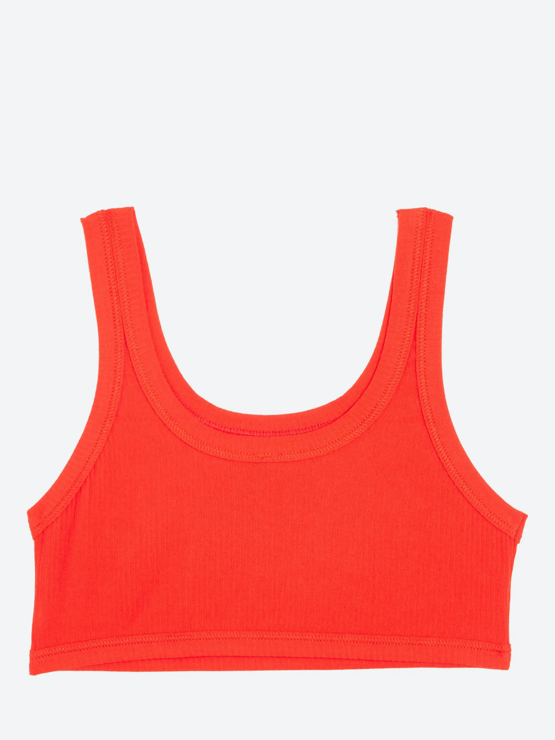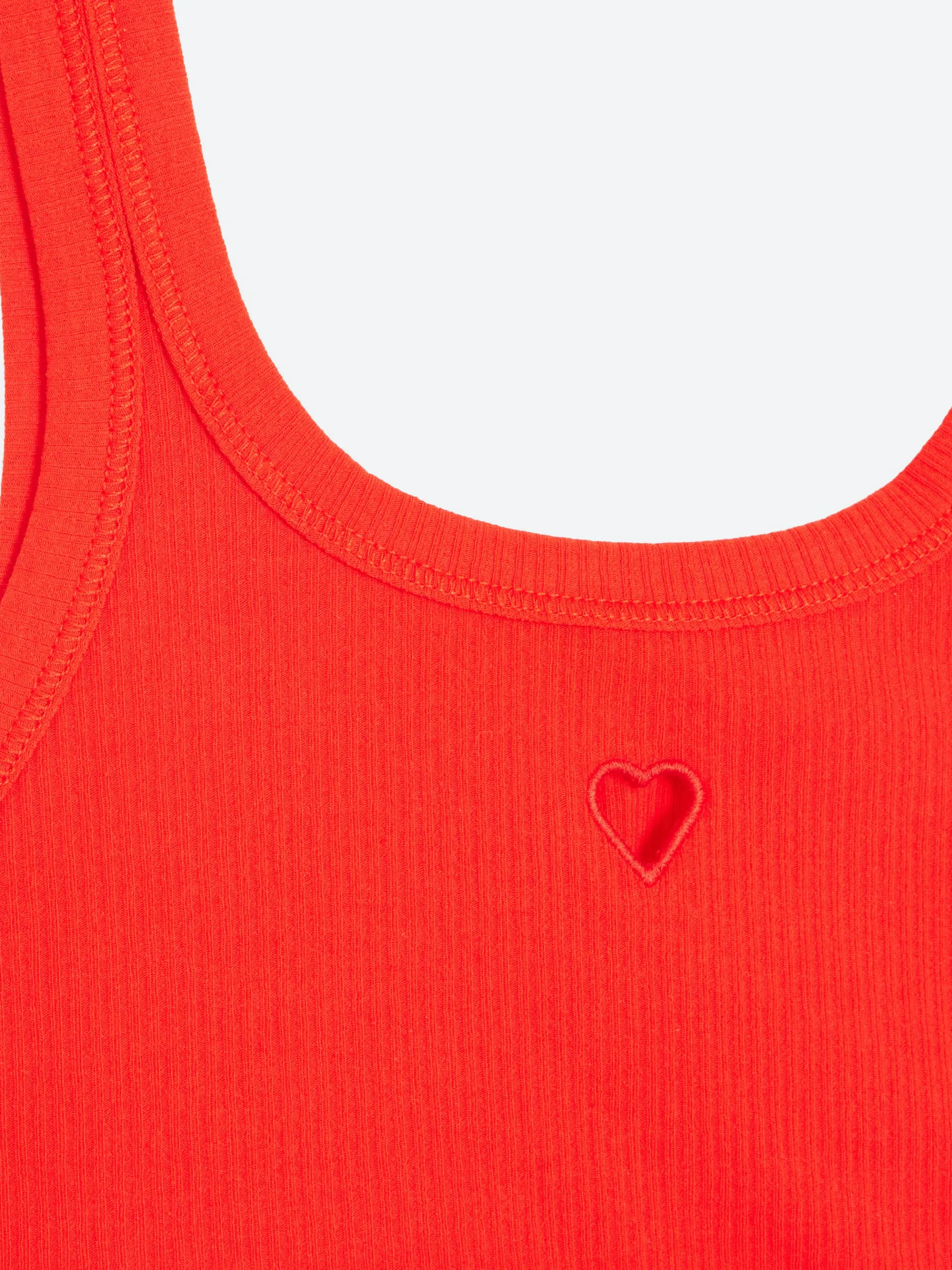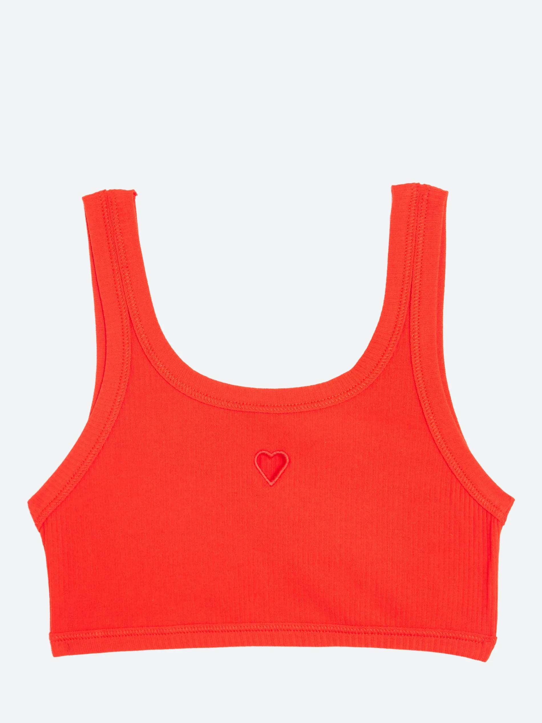 A soft, eco-friendly organic cotton rib bra with heart-shaped embroidery, a front cut-out, and a scoop neckline. Features elastic trim at the neckline and hem, made from cotton for a natural, sustainable touch.