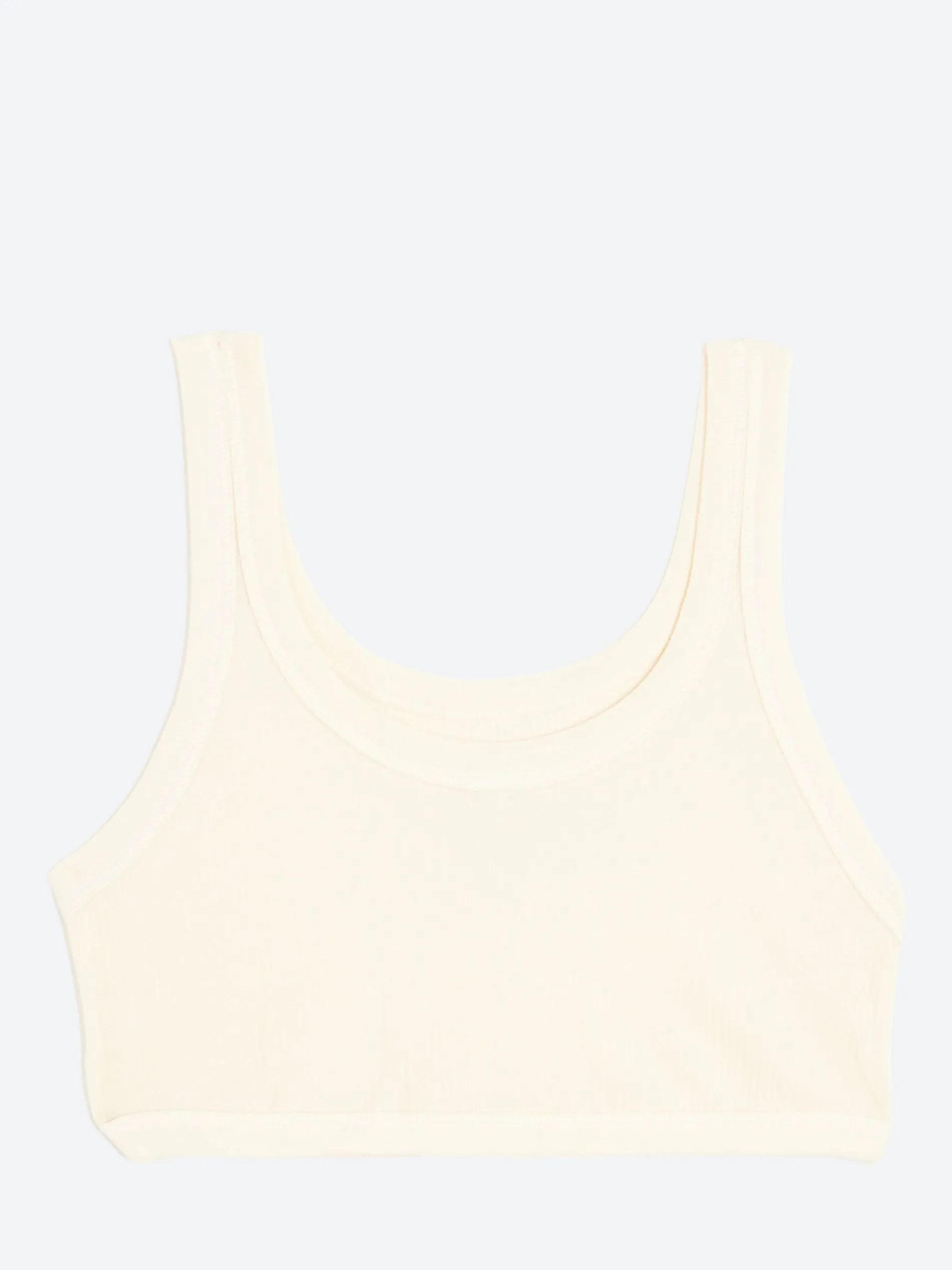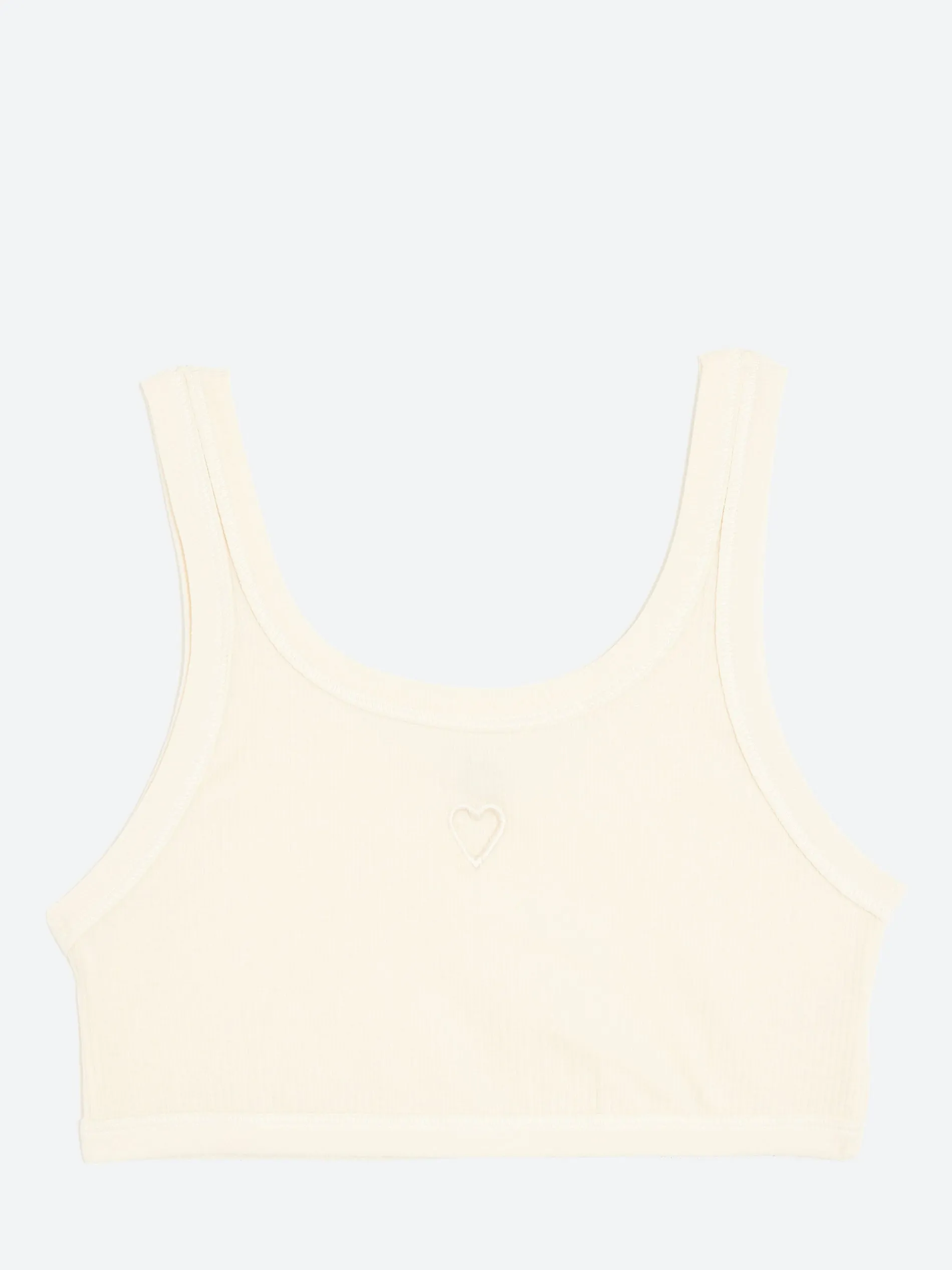 A soft, eco-friendly organic cotton rib bra with heart-shaped embroidery, a front cut-out, and a scoop neckline. Features elastic trim at the neckline and hem, made from cotton for a natural, sustainable touch.