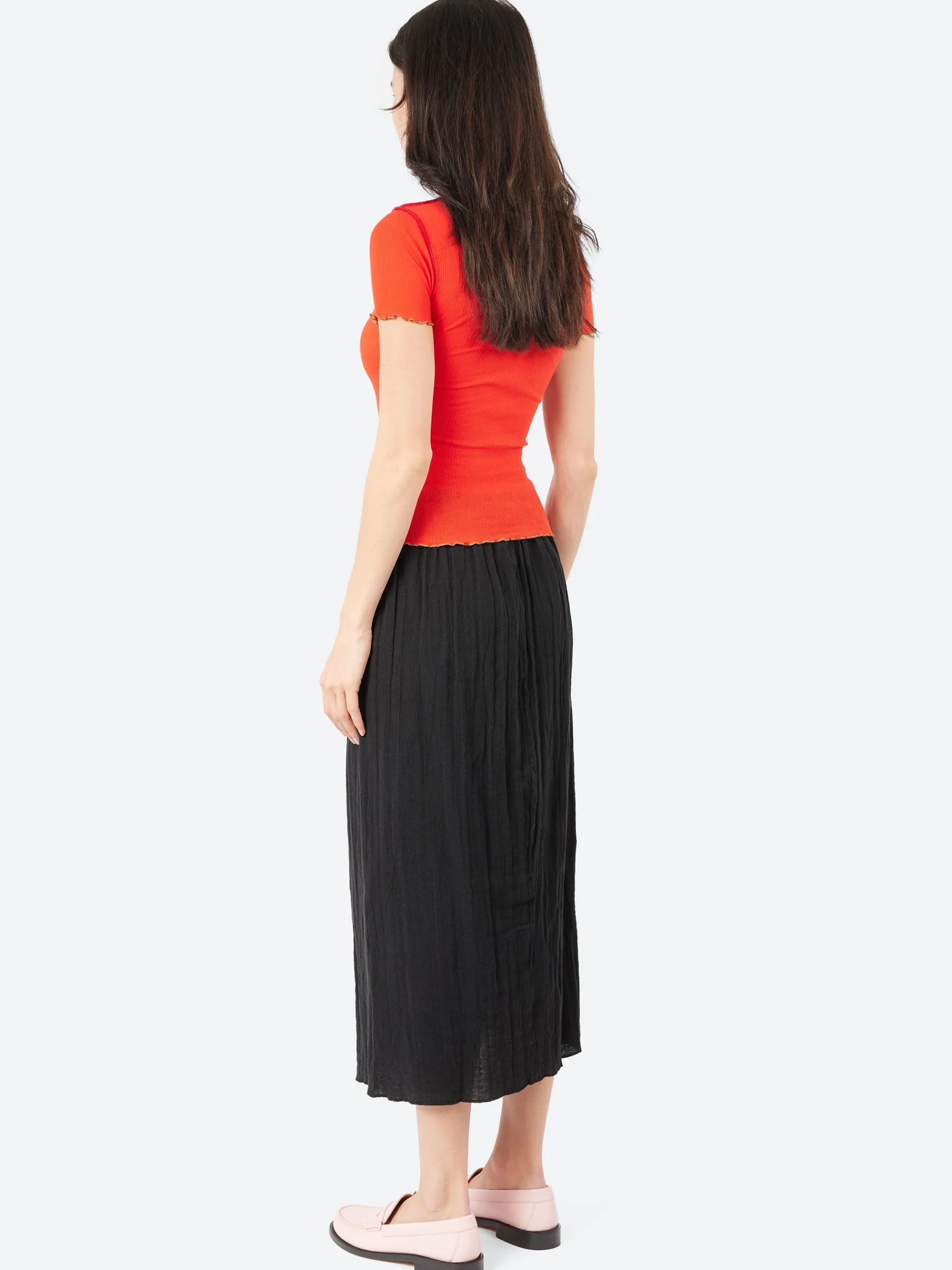 This tee features a formfitting design with a wide neckline, as well as a thin and soft fabric. All seams and edges are finished with a babylock technique for added durability and quality.