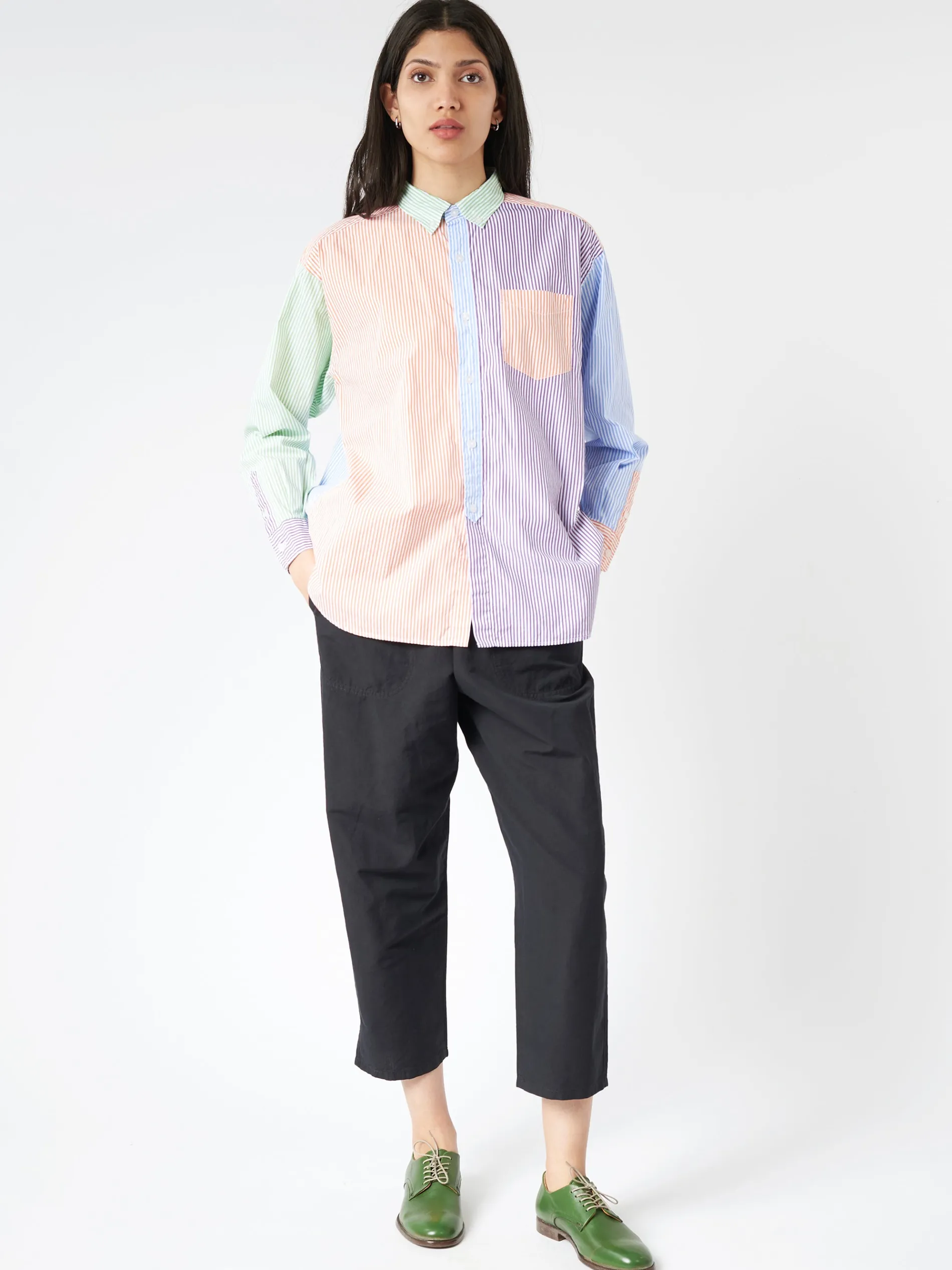BEAMS BOY button-down shirt with vibrant contrasting stripes. Made from high-quality cotton broadcloth.