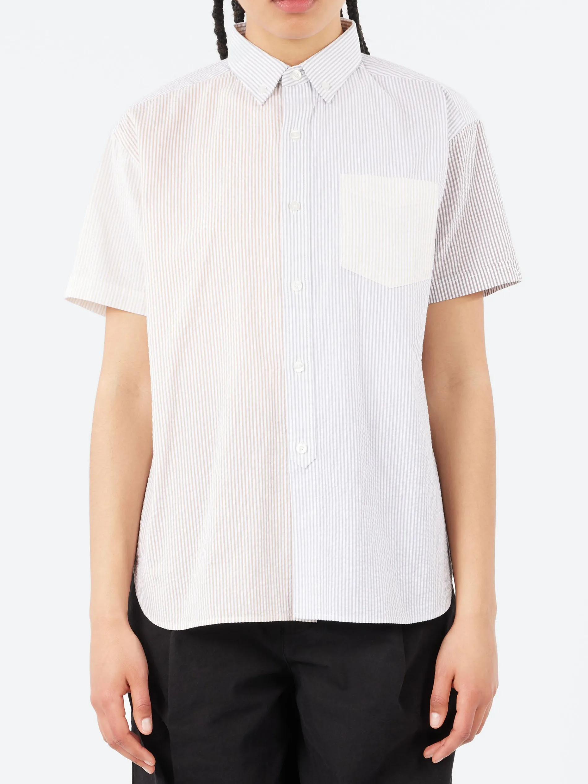 The BEAMS BOY Seersucker Short Sleeve Shirt in Multi is a lightweight, 100% cotton shirt featuring a relaxed fit and vibrant contrasting stripes. Designed with a classic collar, front button closure, and chest pocket, this breathable seersucker piece blends menswear-inspired style with a feminine touch. Perfect for casual or smart-casual wear.