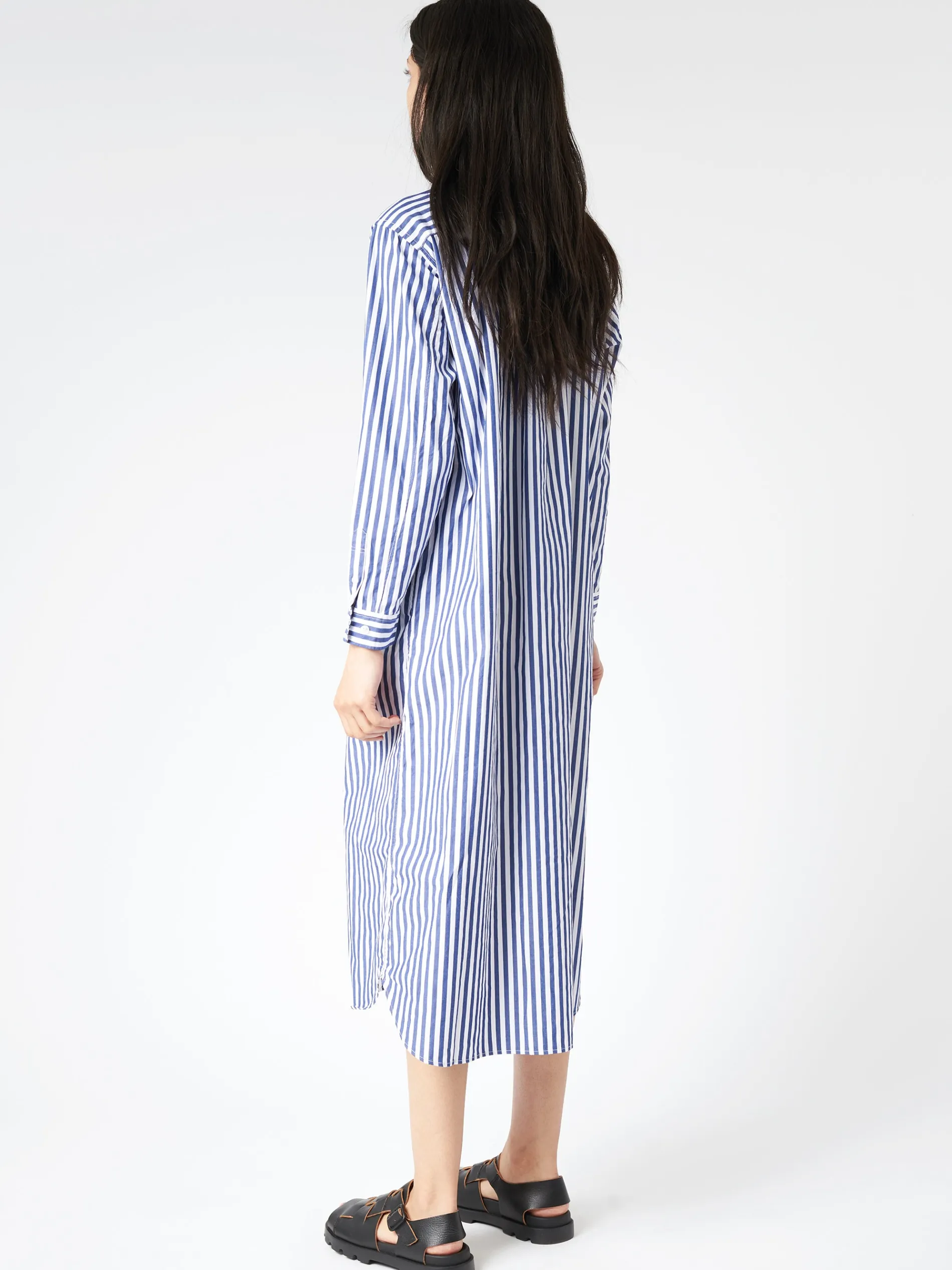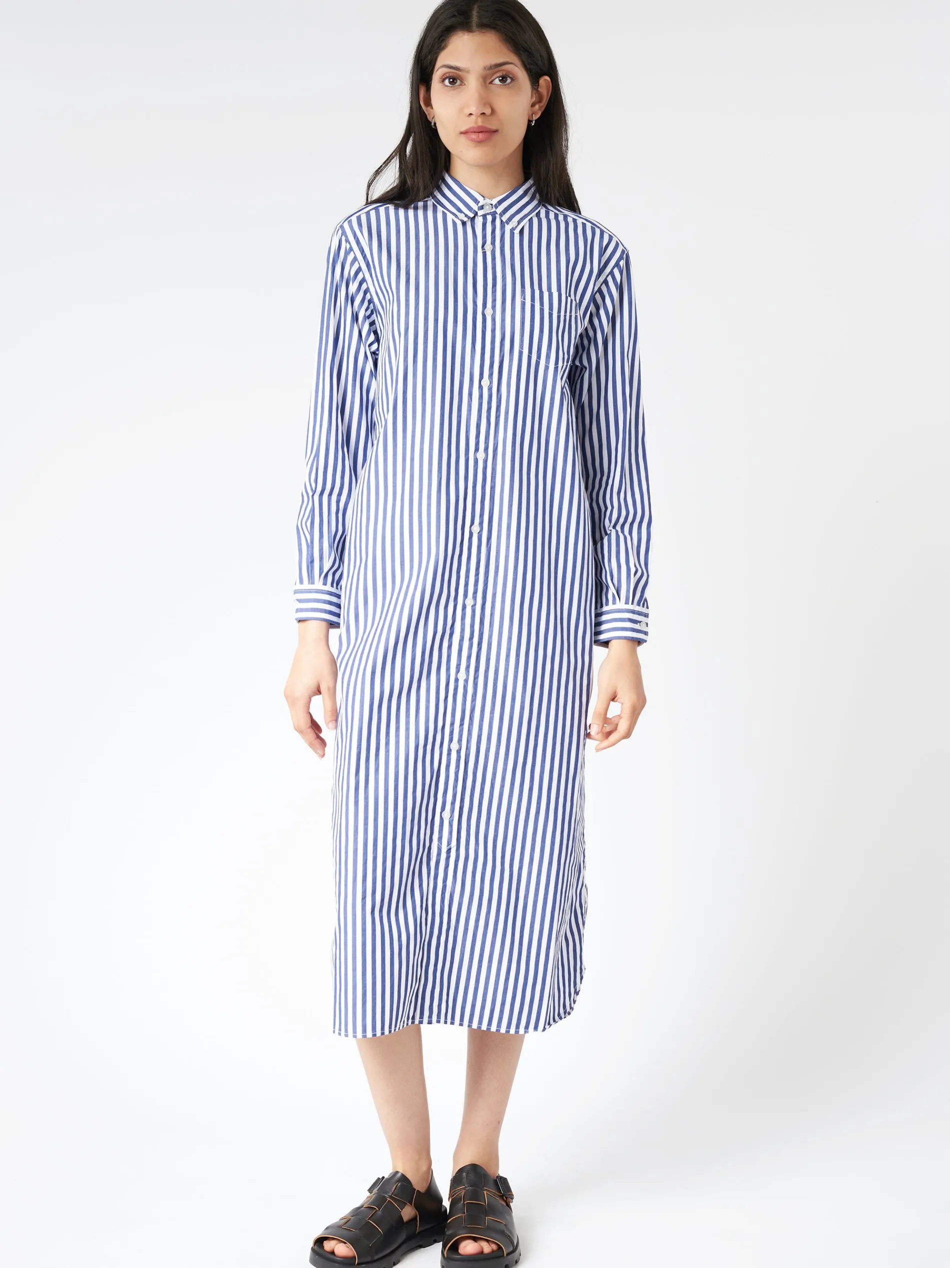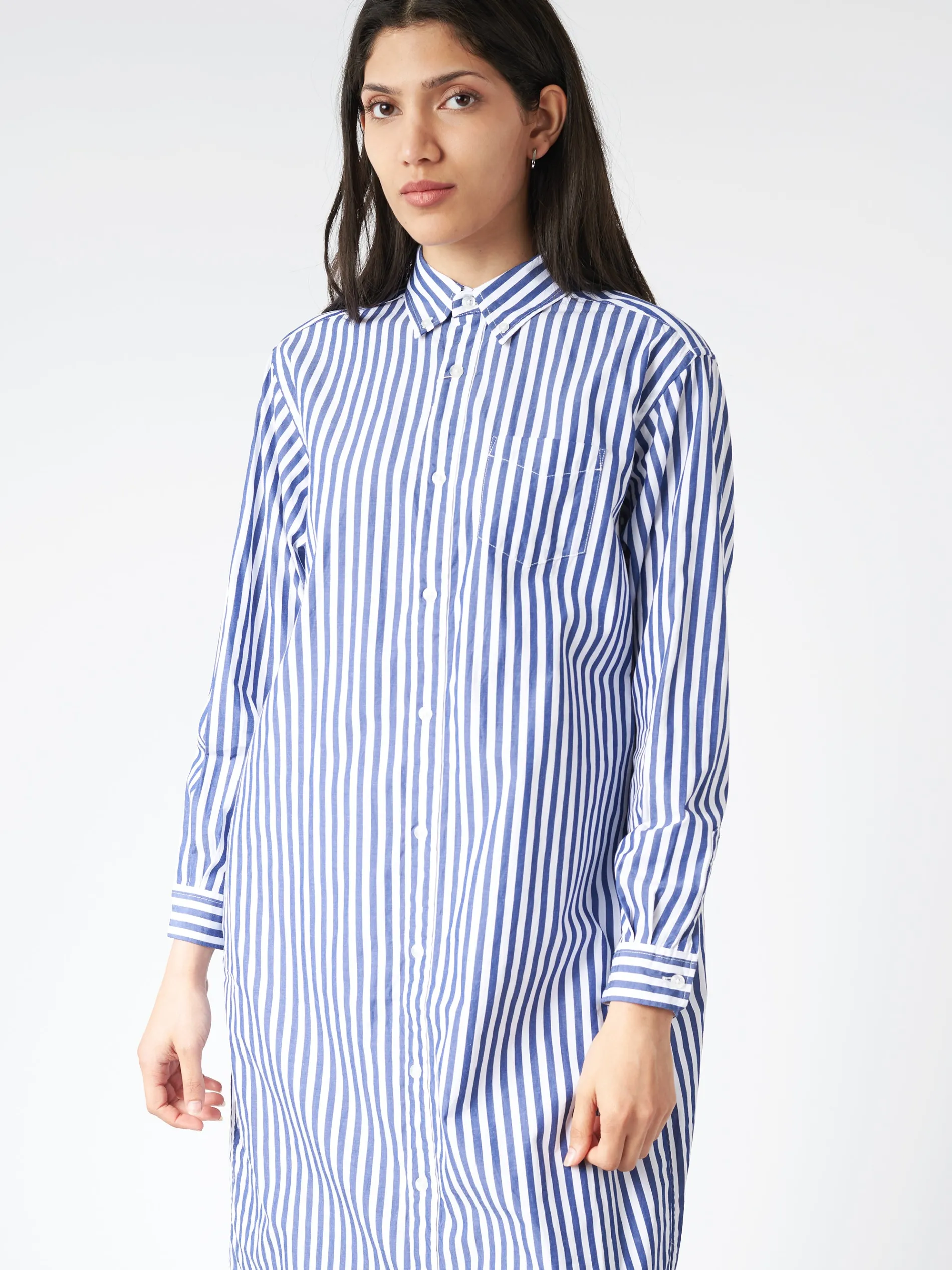 A button-down long-sleeved shirt dress with a classic striped pattern.