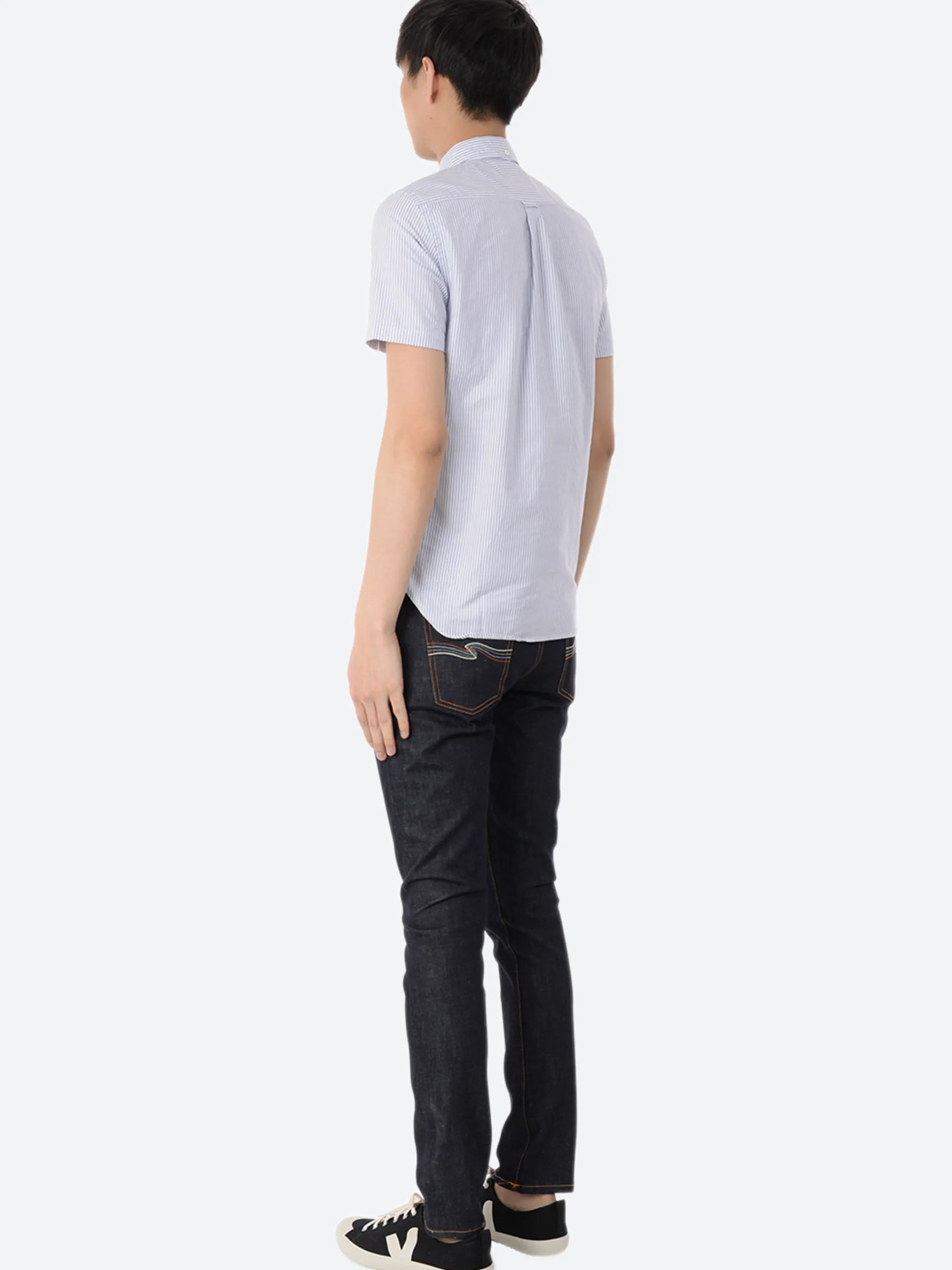 Beams Plus candy striped short sleeve shirt in blue and white oxford cotton. Styled for a preppy look and feel.