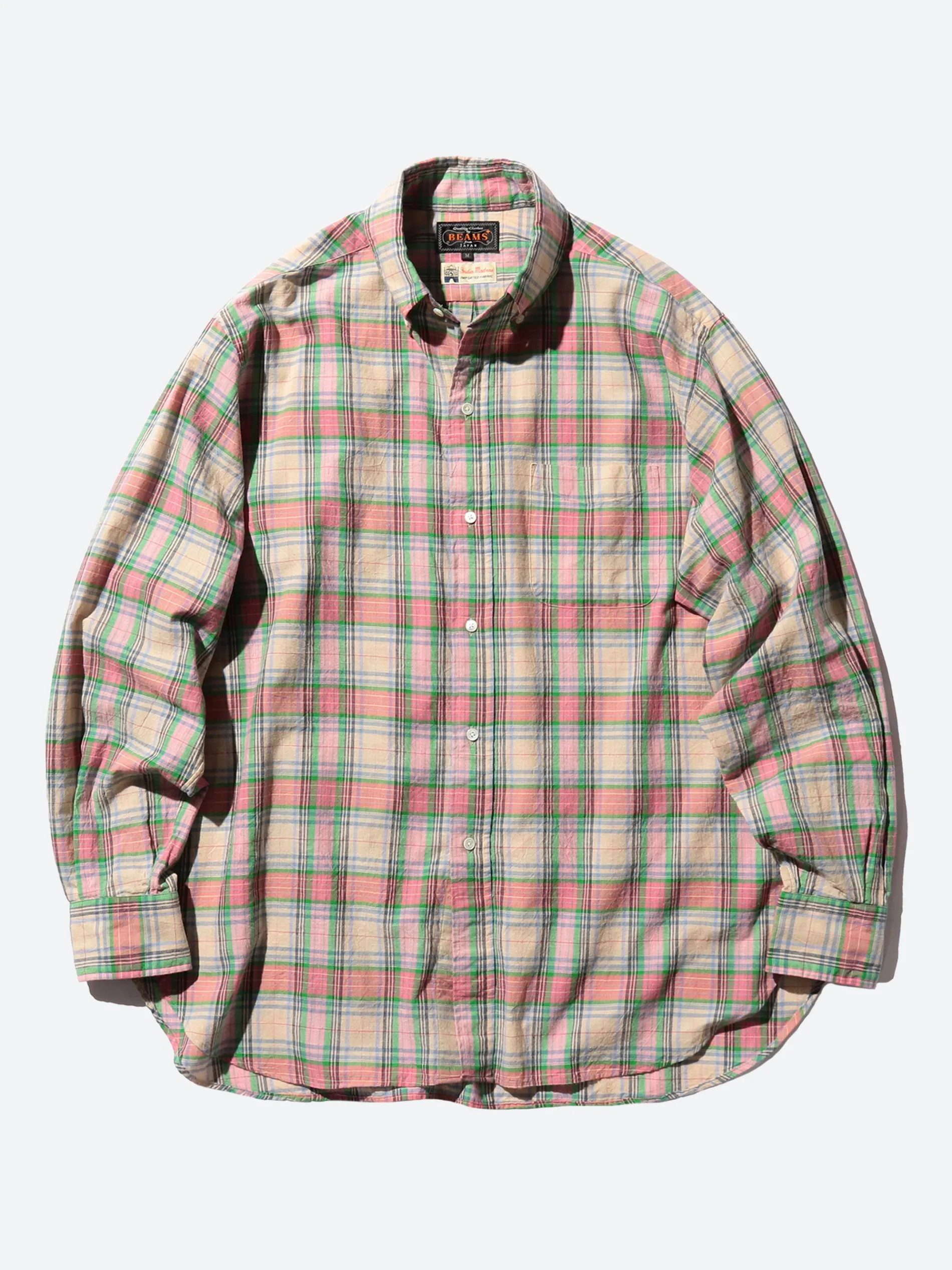 This BEAMS PLUS button-down shirt showcases the Madras check pattern, a traditional design originating from the Madras region in southeastern India. The buttons on the front are slightly offset, creating a well-balanced appearance. With its long length and distinctive silhouette, the shirt offers a relaxed fit, providing extra room in the chest and shoulders compared to regular BEAMS PLUS button-downs. Its generous sizing makes it a versatile piece, perfect for casual styles.