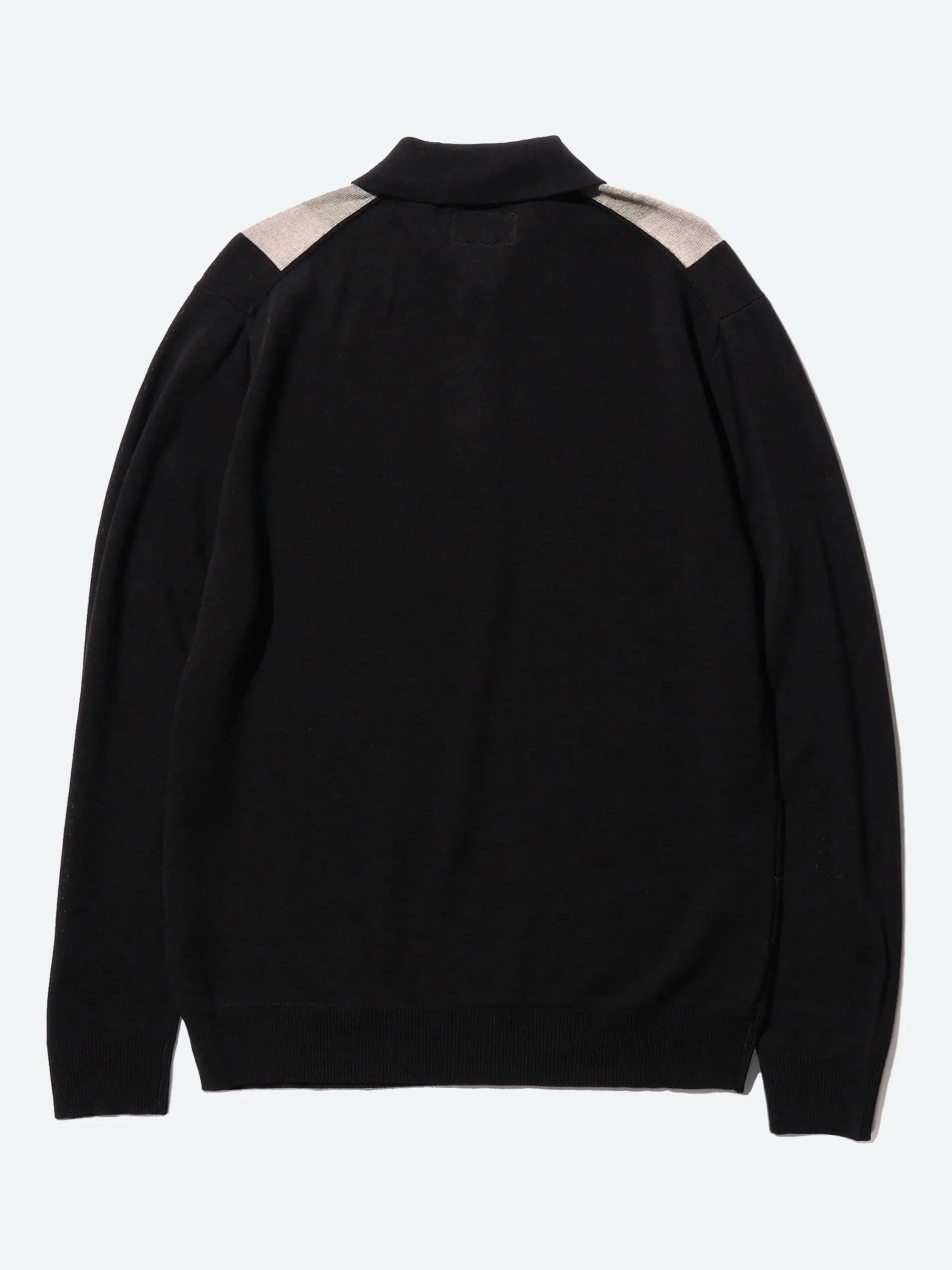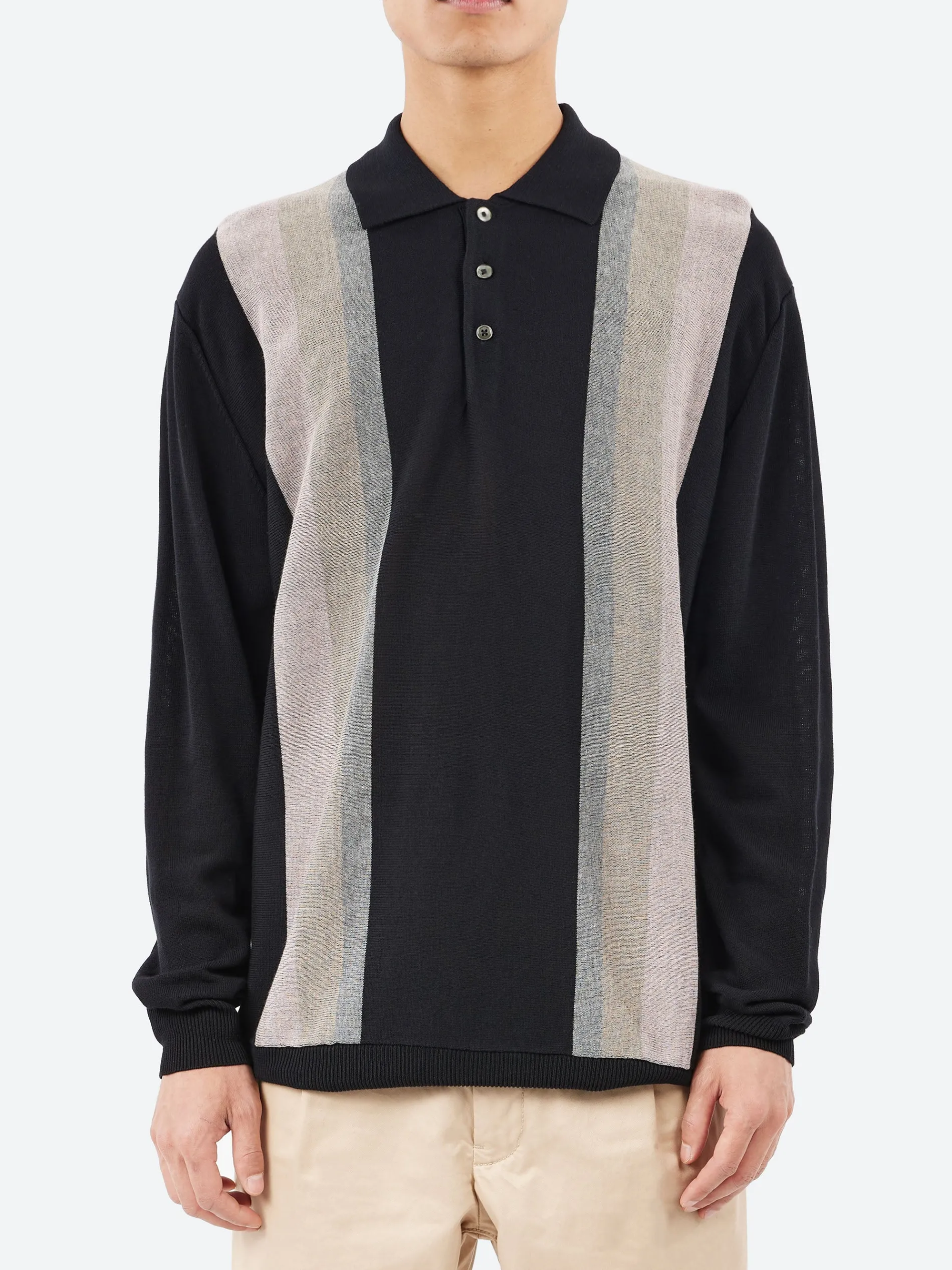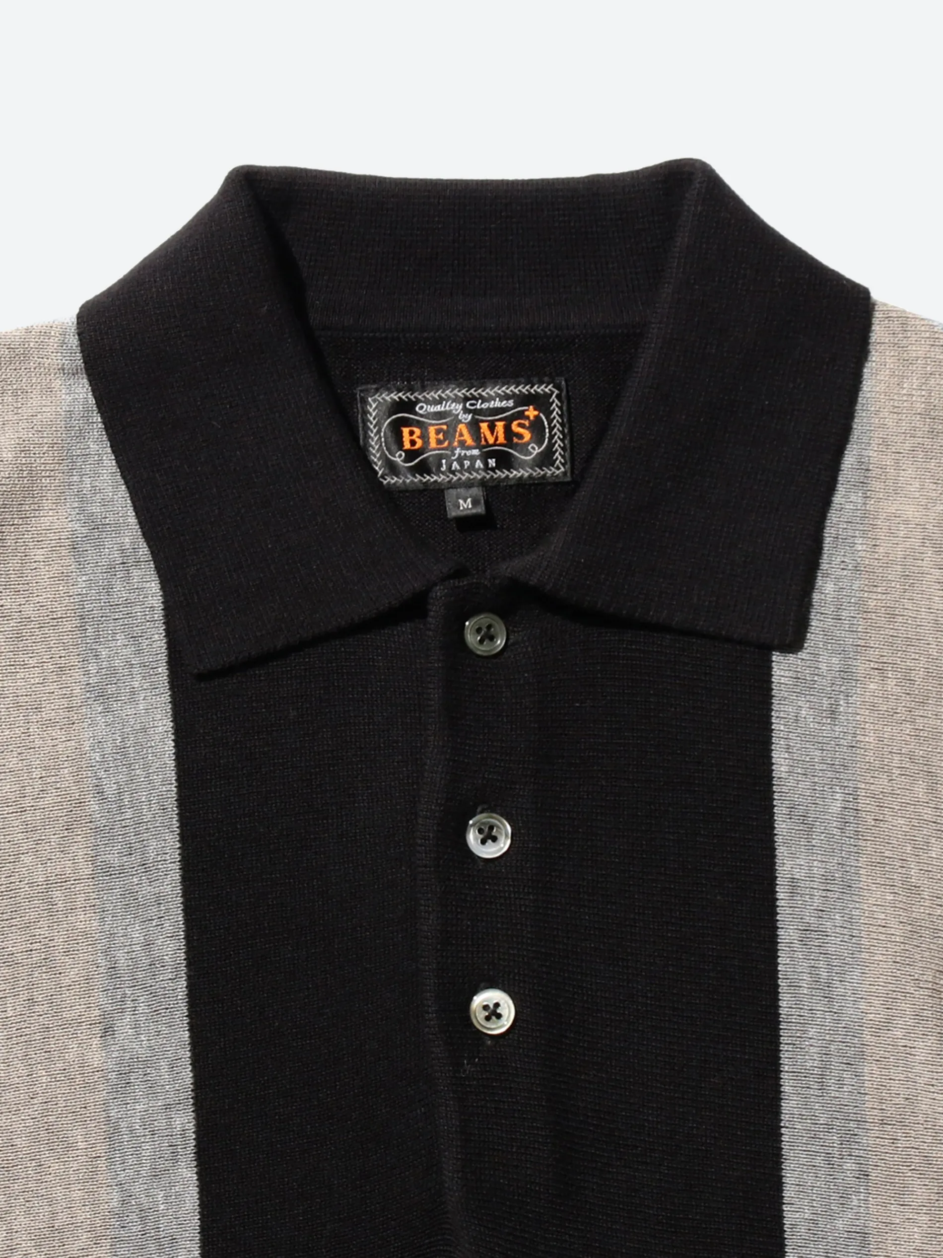 The BEAMS PLUS long-sleeved knit polo shirt features a gradient stripe accent on the front, while the back and sleeves are solid colors, creating a classic and understated look. The polo is crafted using a technique called “plating knitting,” with different materials on the front and back. The front is made of tightly twisted yarn for a crisp, dry touch, while the back is made of viscose, providing a smooth and comfortable feel against the skin.