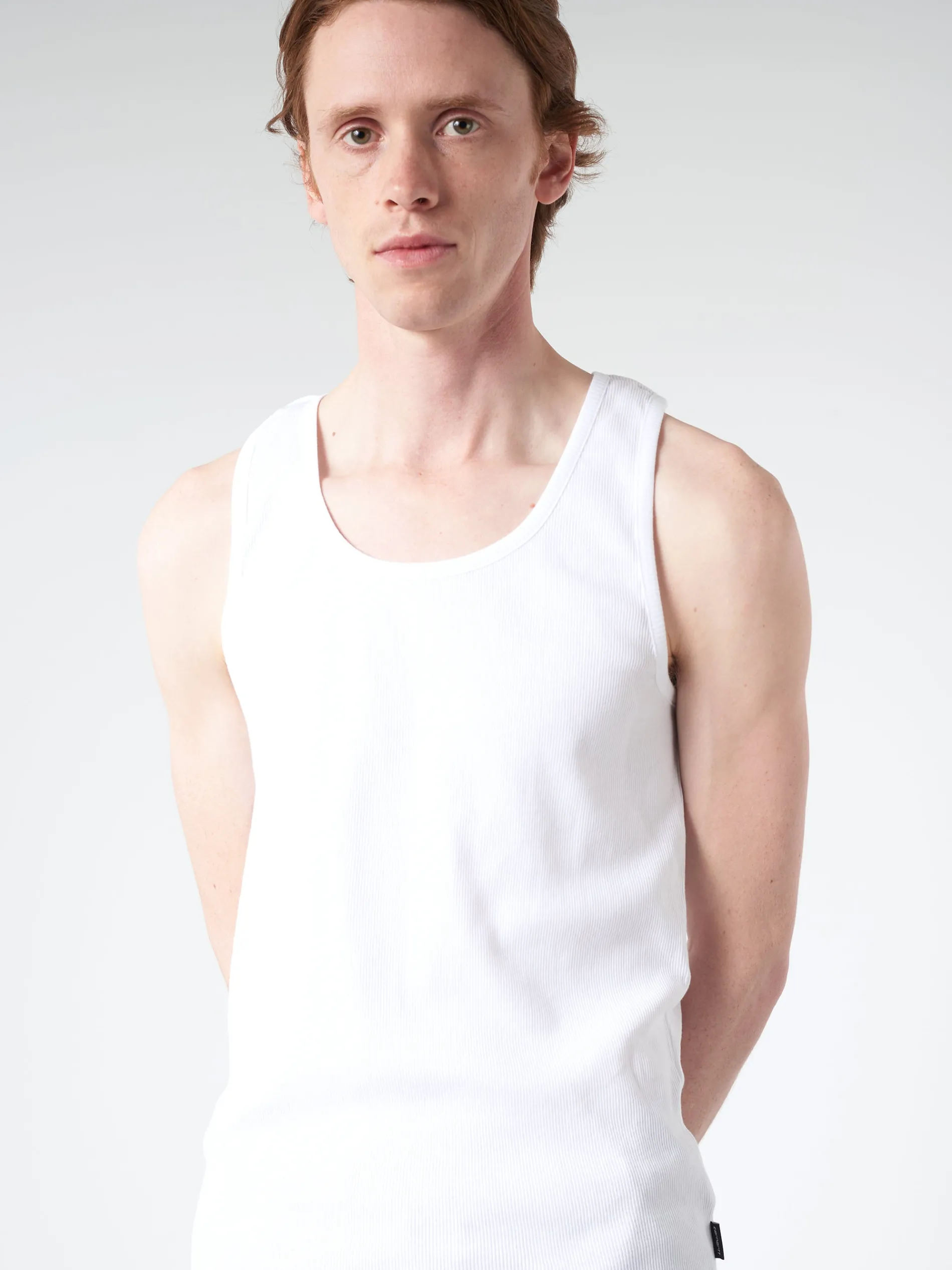 The A-Shirt is made of rib-knit organic cotton and is detailed with a flag label by the bottom band. It comes in its own packaging as a set of two.