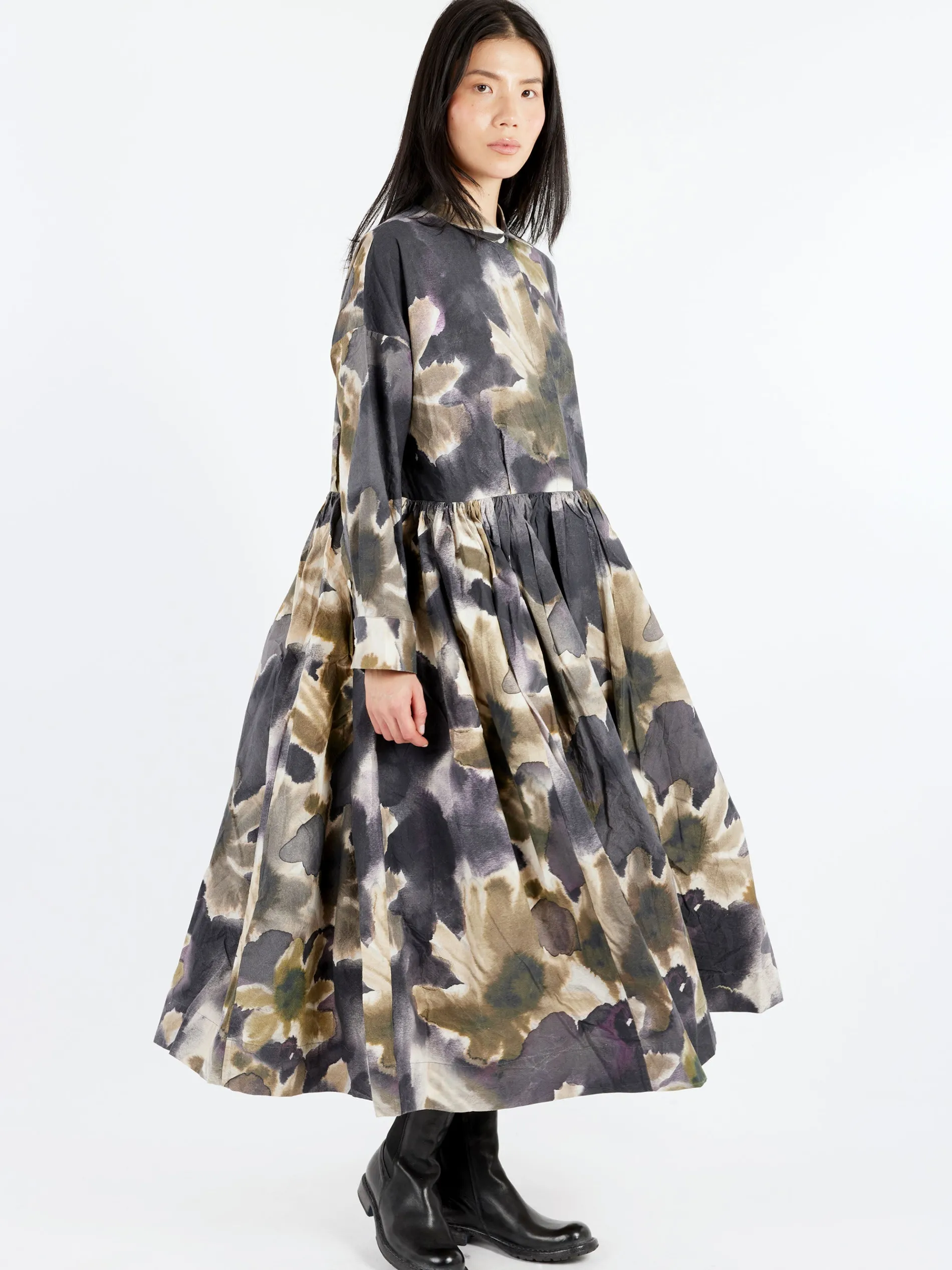 Casey Casey dress in print blotch with gathering from the waist to the bottom.