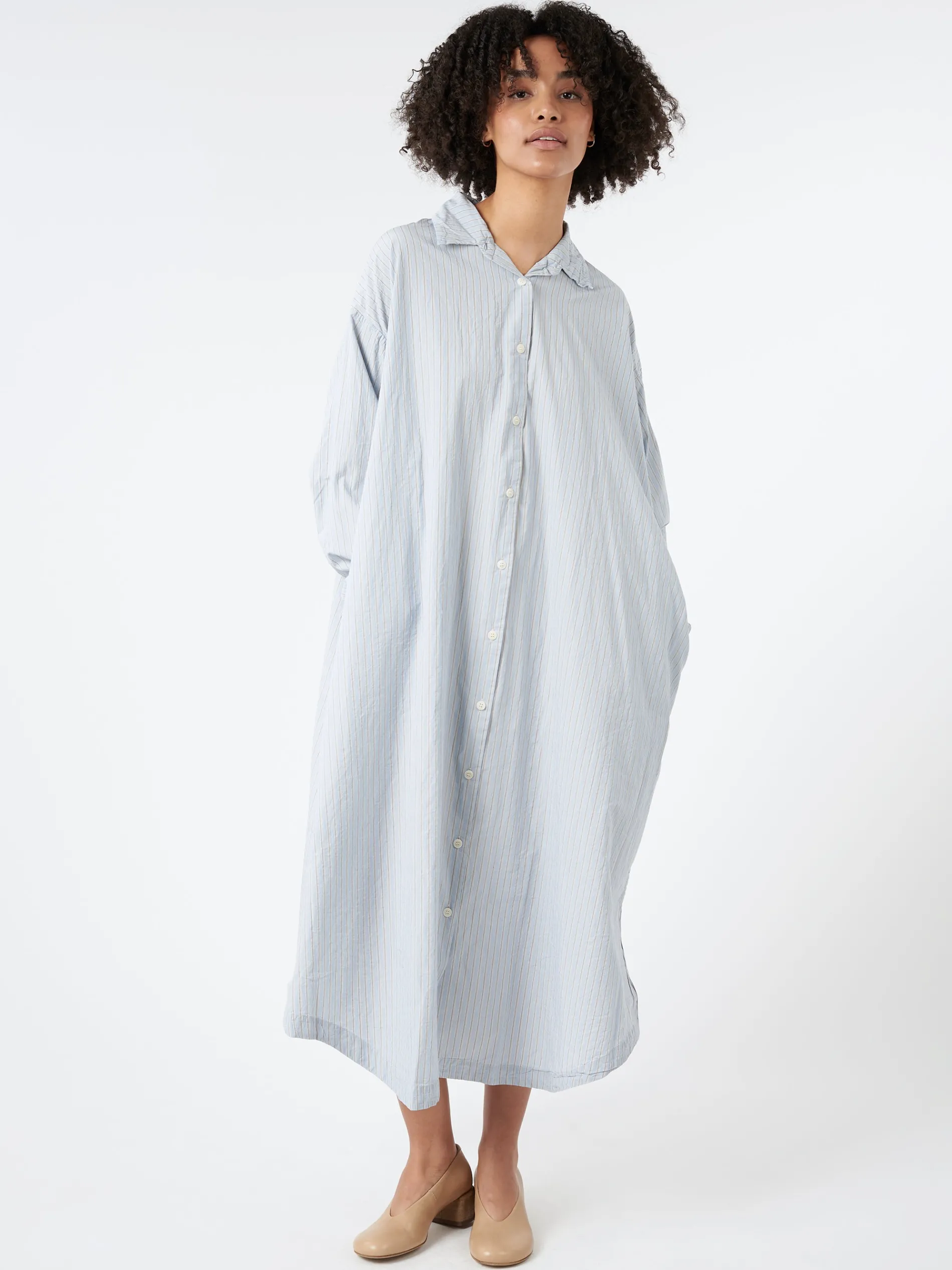 Casey Casey long sleeve shirt dress in a lightweight pinstriped cotton fabric whose beauty increases at each wash.