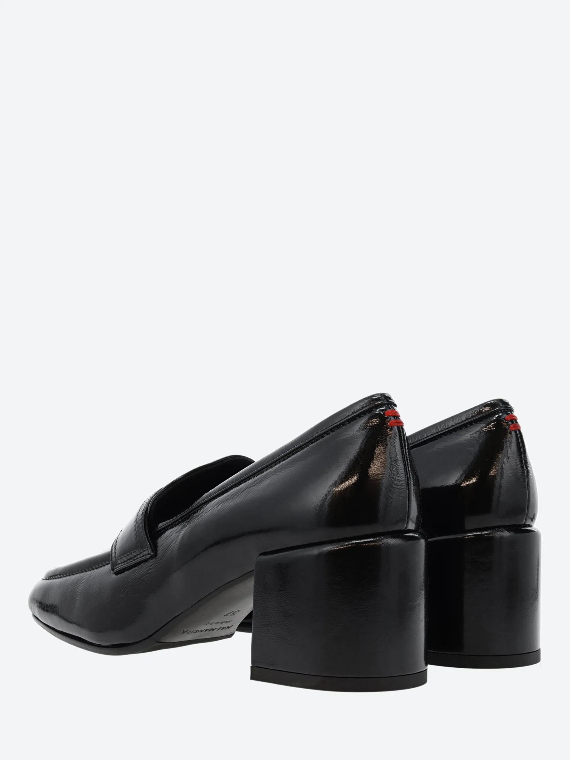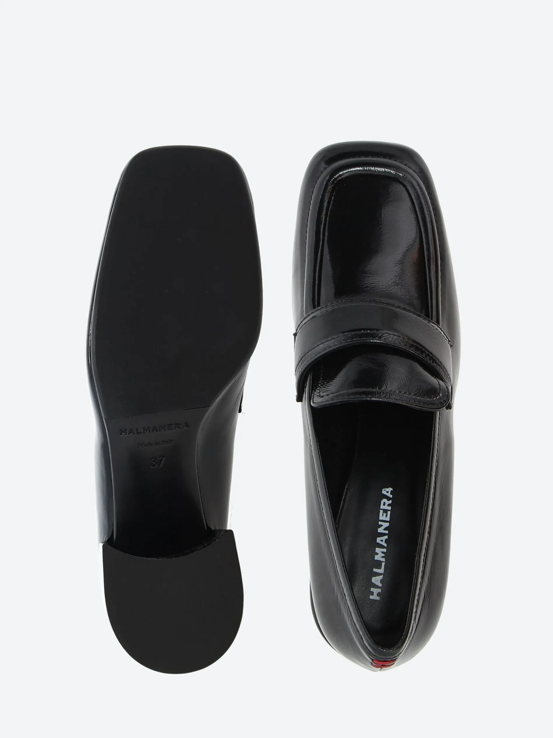 Halmanera heeled loafer in shiny leather. A slip-on style for easy on and off. Finished with a self covered wooden heel.