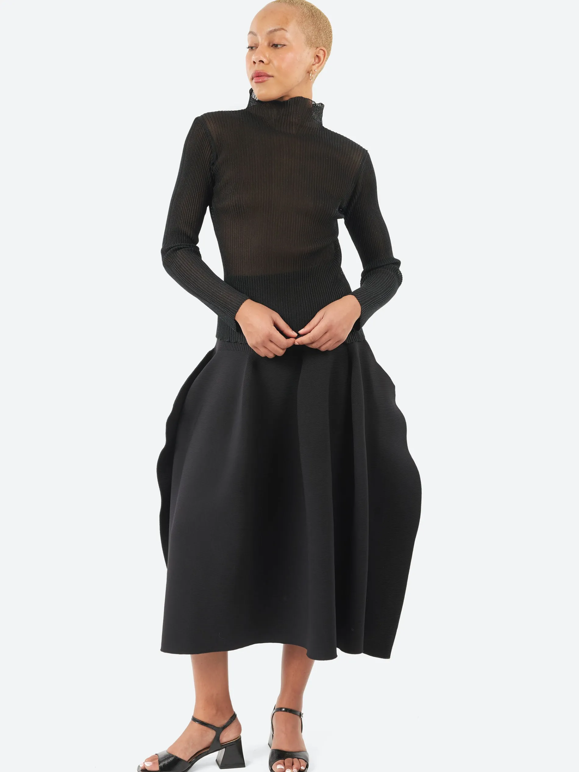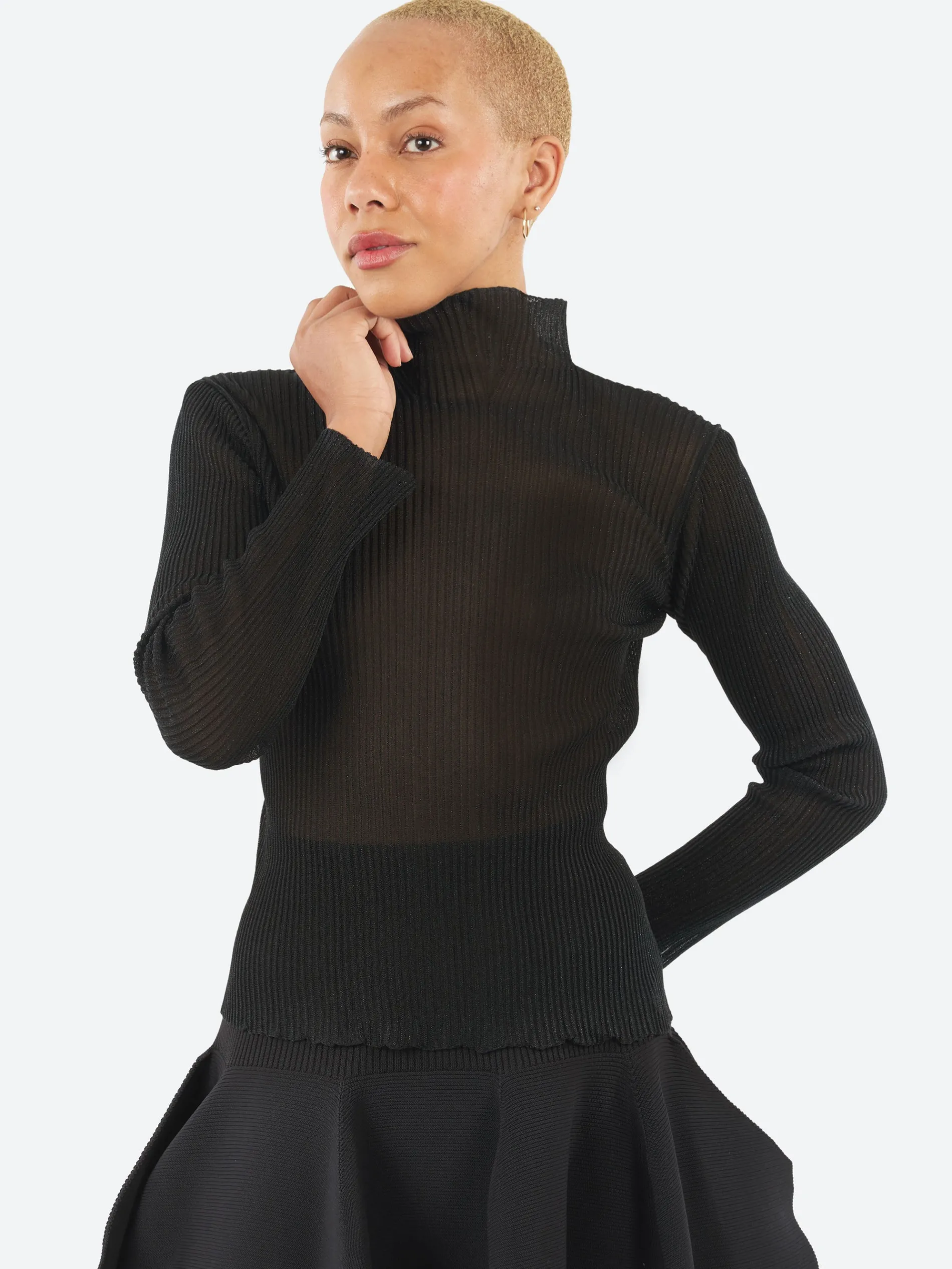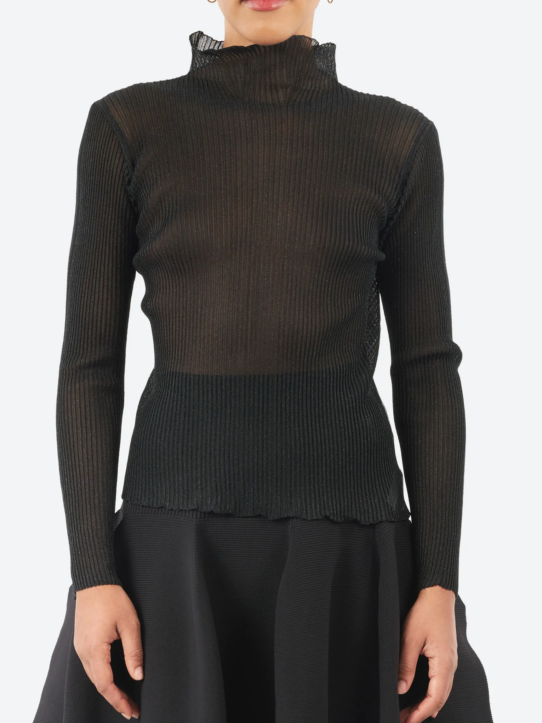 The CFCL Hypha Lucent Glitter Long Sleeve Top is designed with a unique pintuck knit structure combining sheer and opaque materials. It features a flared high-neck, a slim-fitting silhouette, and a seamless finish for a polished, contemporary style.