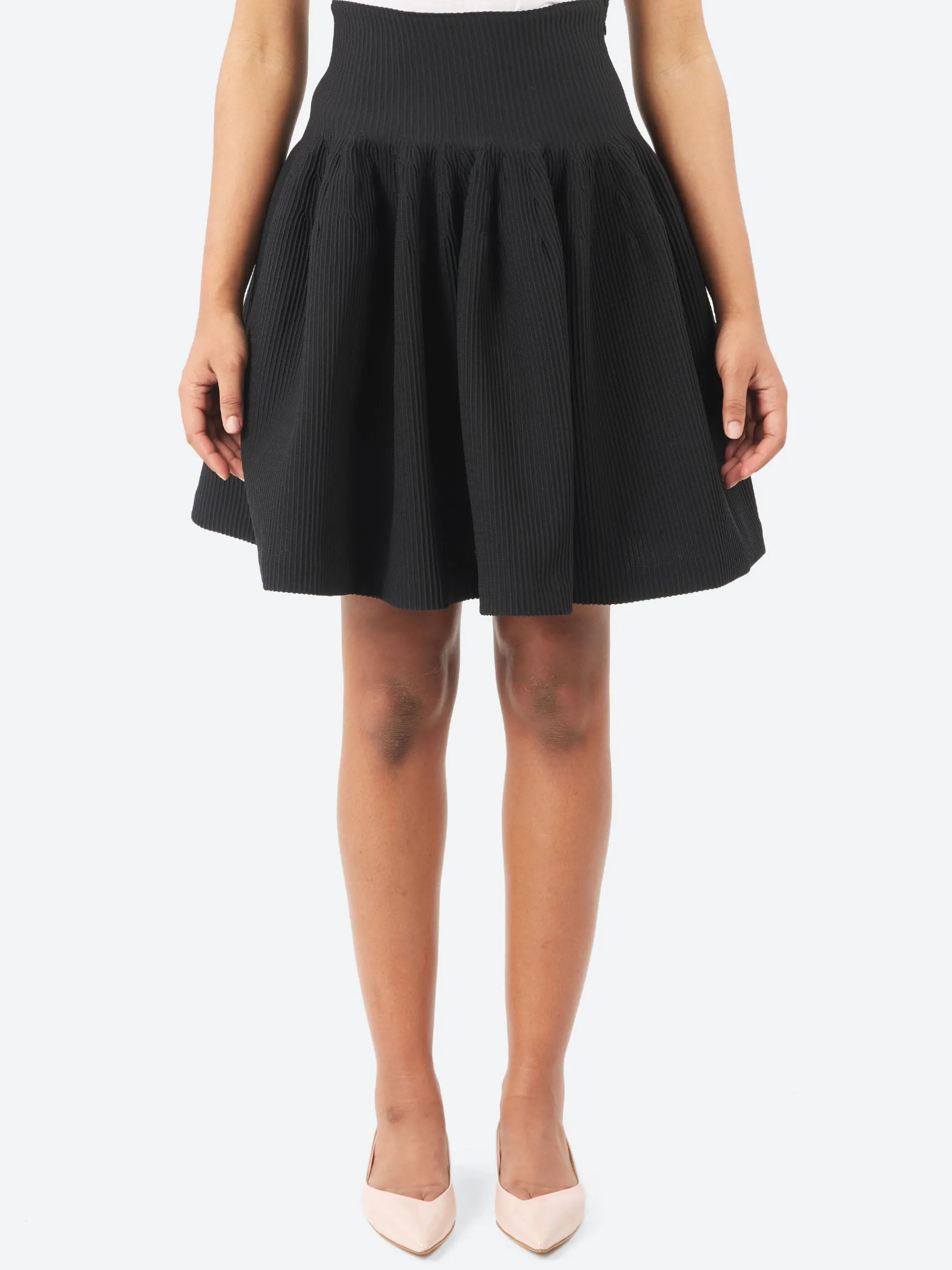 The CFCL Hypha Mini Skirt features a textured pintuck knit with a dimensional flared silhouette. It has a high-waisted, midi-length design, with a concealed zipper on the left side for a smooth and modern finish.