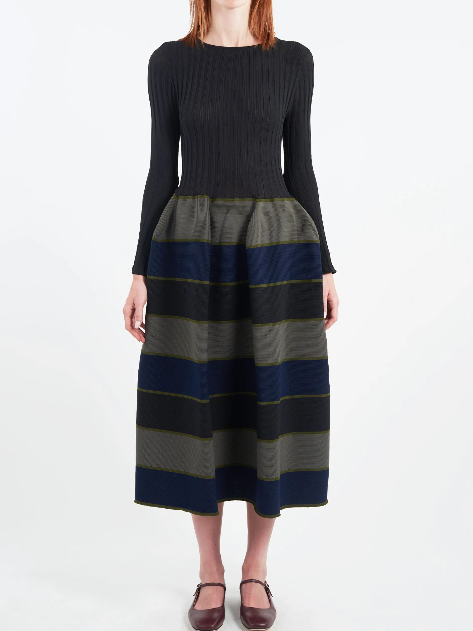 Inspired by the fine lines in ceramic pottery, this CFCL pleated dress’ voluminous constructed form is created by computer programming. The seamless knit is made entirely from recycled polyester.
