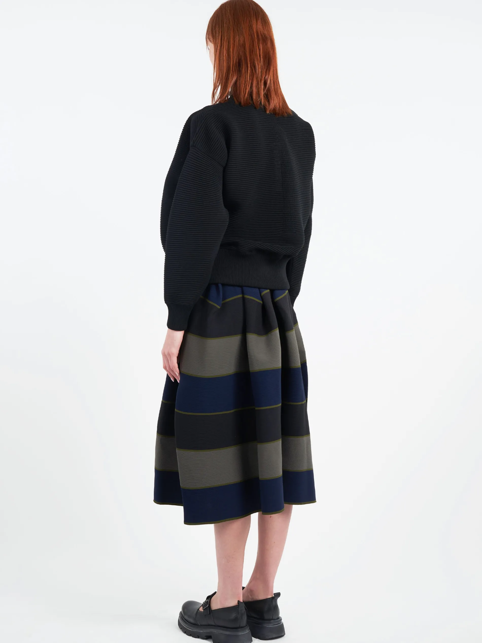 This bomber jacket from CFCL has a textured pintuck knit structure. With its voluminous silhouette and high neck, it provides endless versatility.