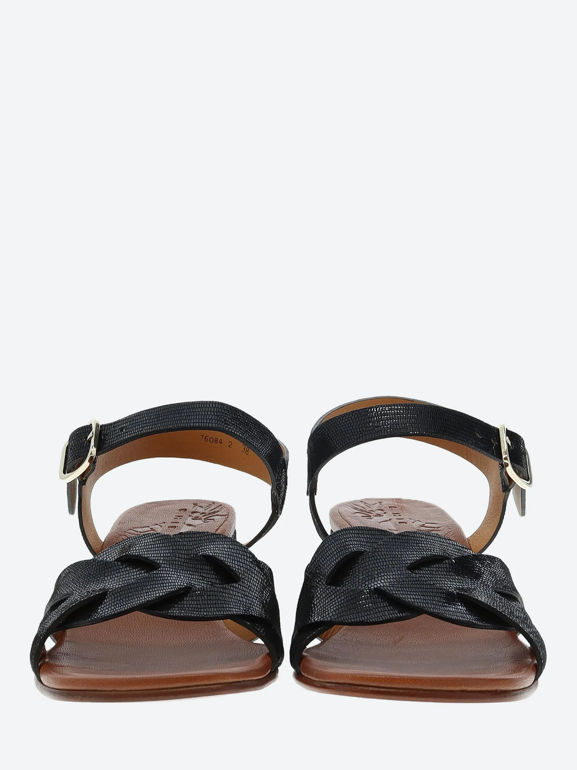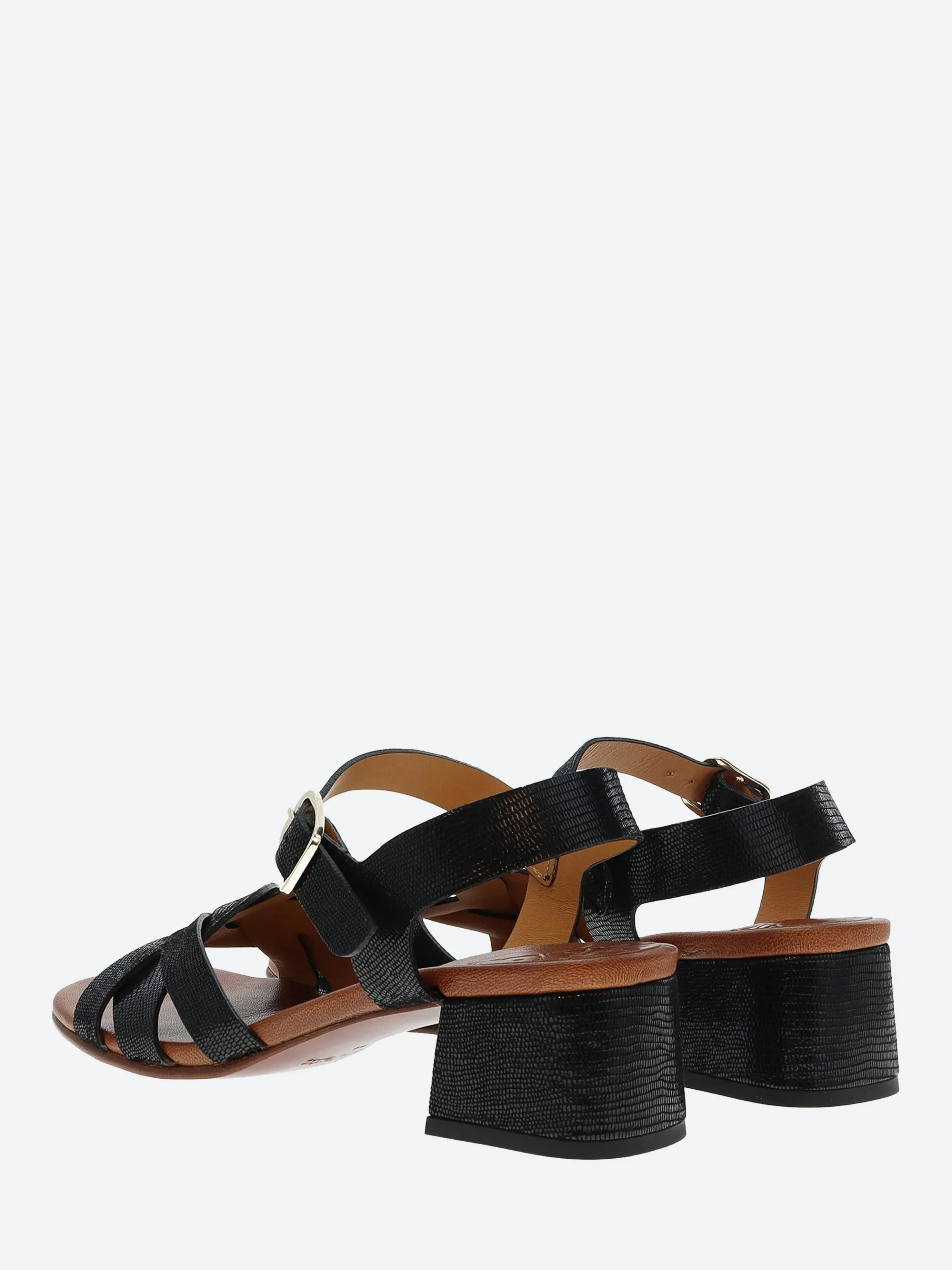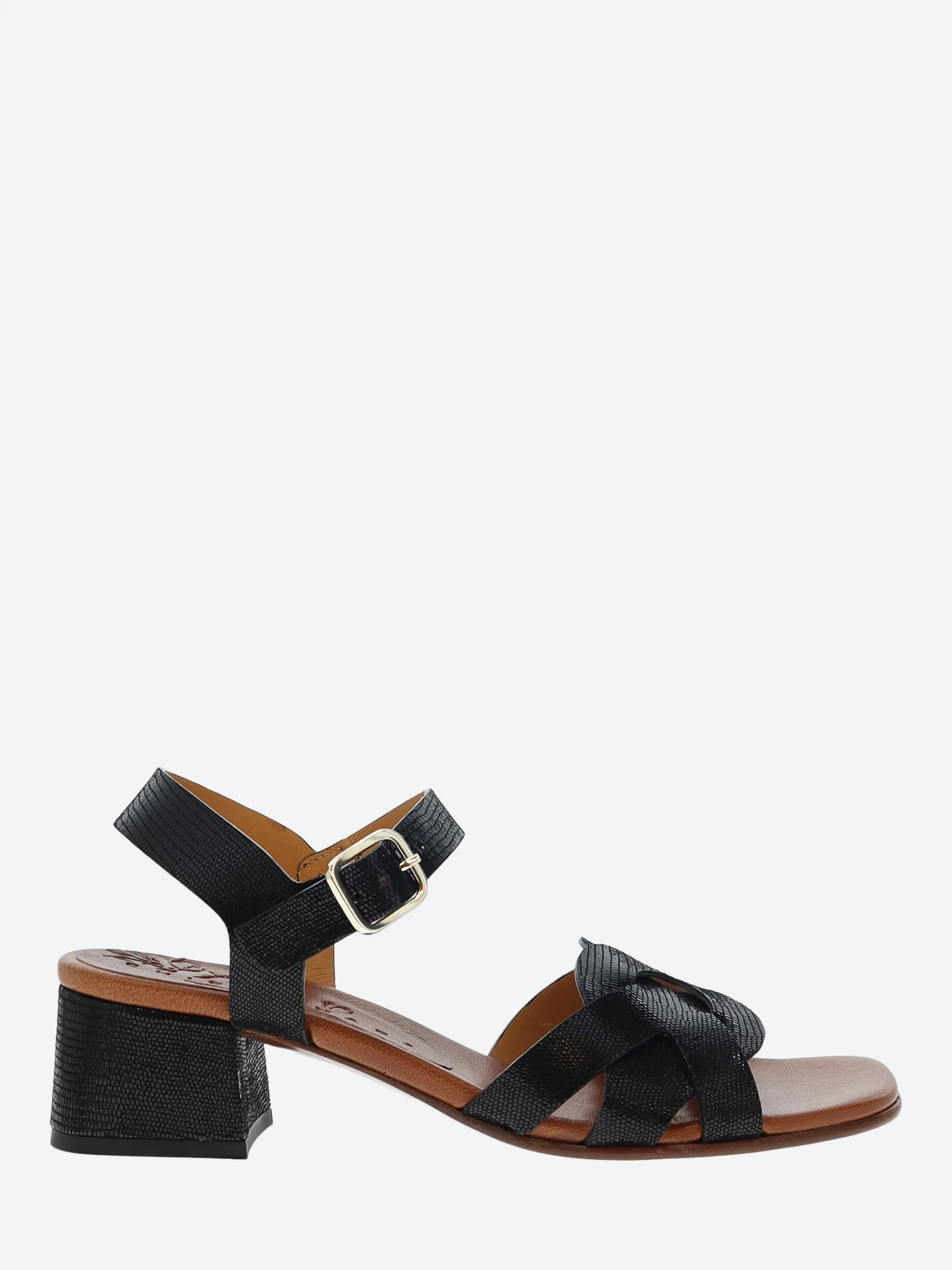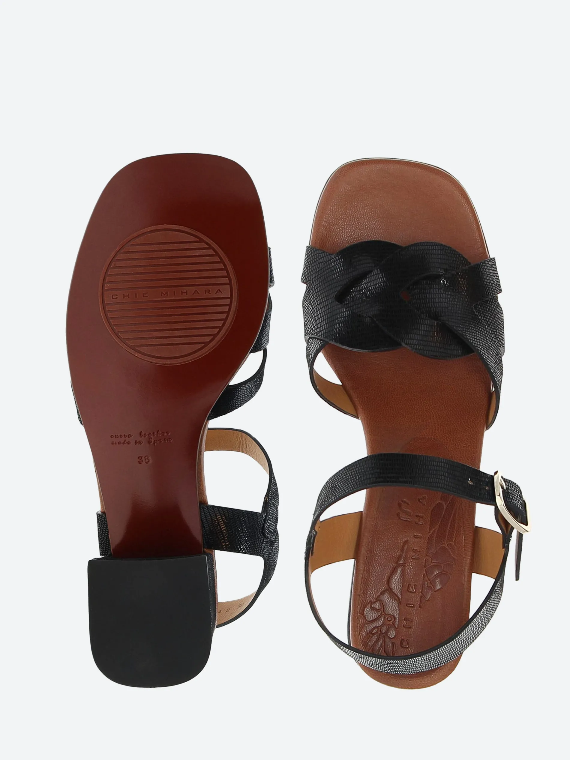 Chie Mihara’s Quara woven sandal made from leather, sitting on a block heel that elongates your profile.