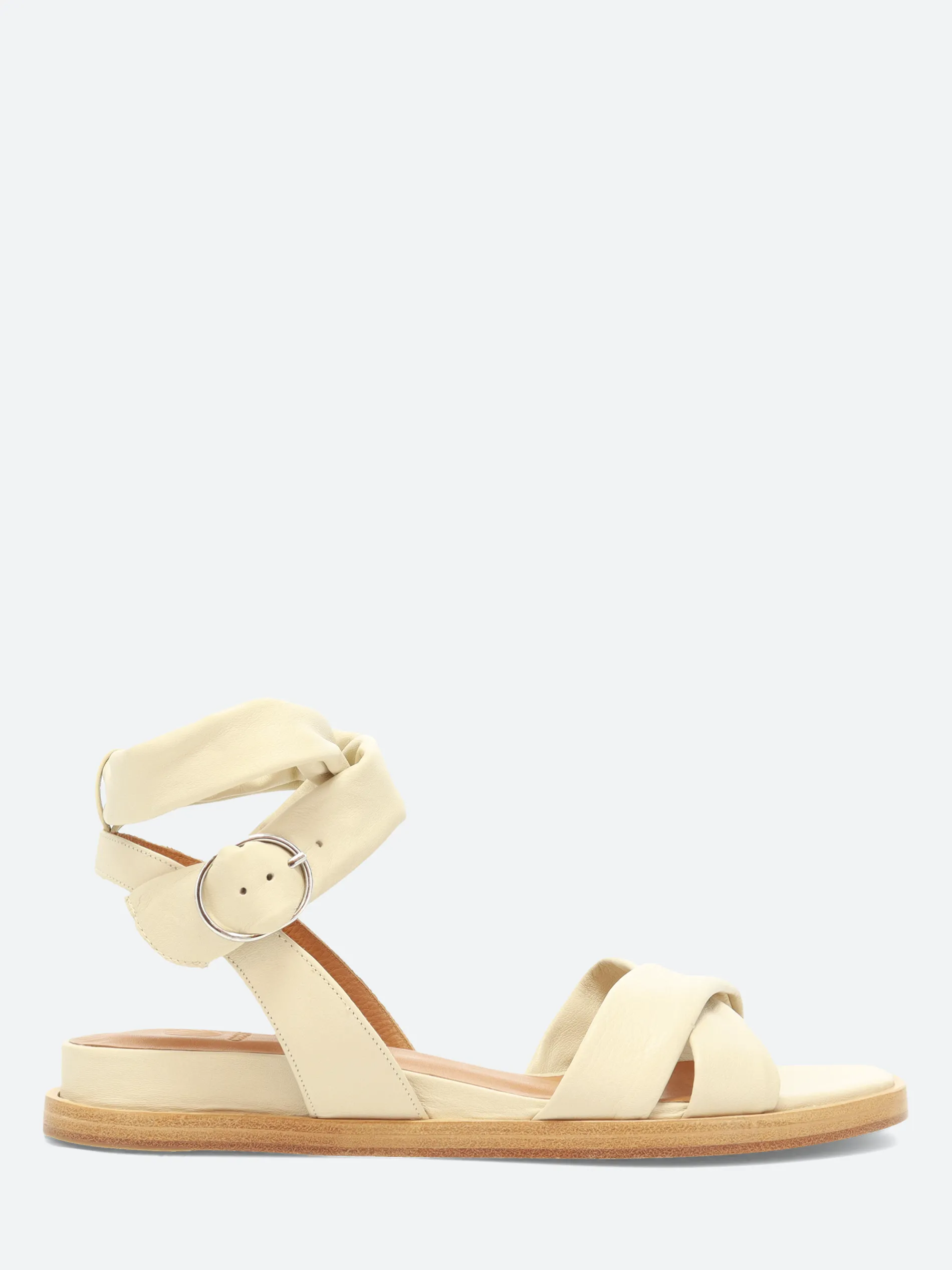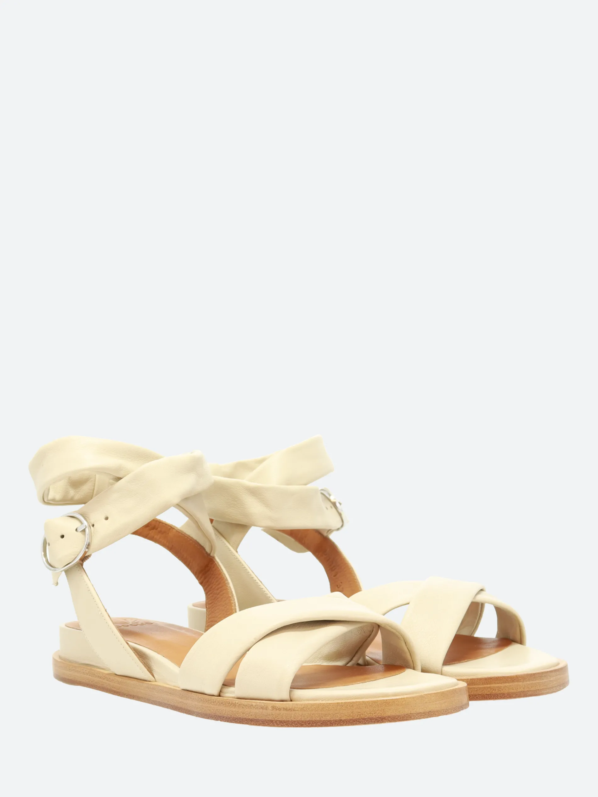Supple tubular straps cross and support the foot and ankle. Inset leather wrapped wedge and a layered leather sole for urban style and durability.