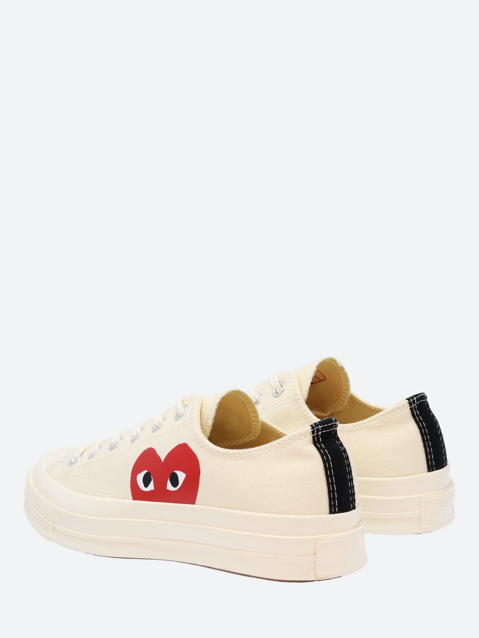 The Converse x Comme des Garçons PLAY Chuck 70 features classic Chuck Taylor styling with a playful twist. The quirky heart-and-eyes logo, imagined by New York graphic artist Filip Pagowski and Comme des Garçons’ Rei Kawakubo, is as recognizable as the Chuck Taylor itself.