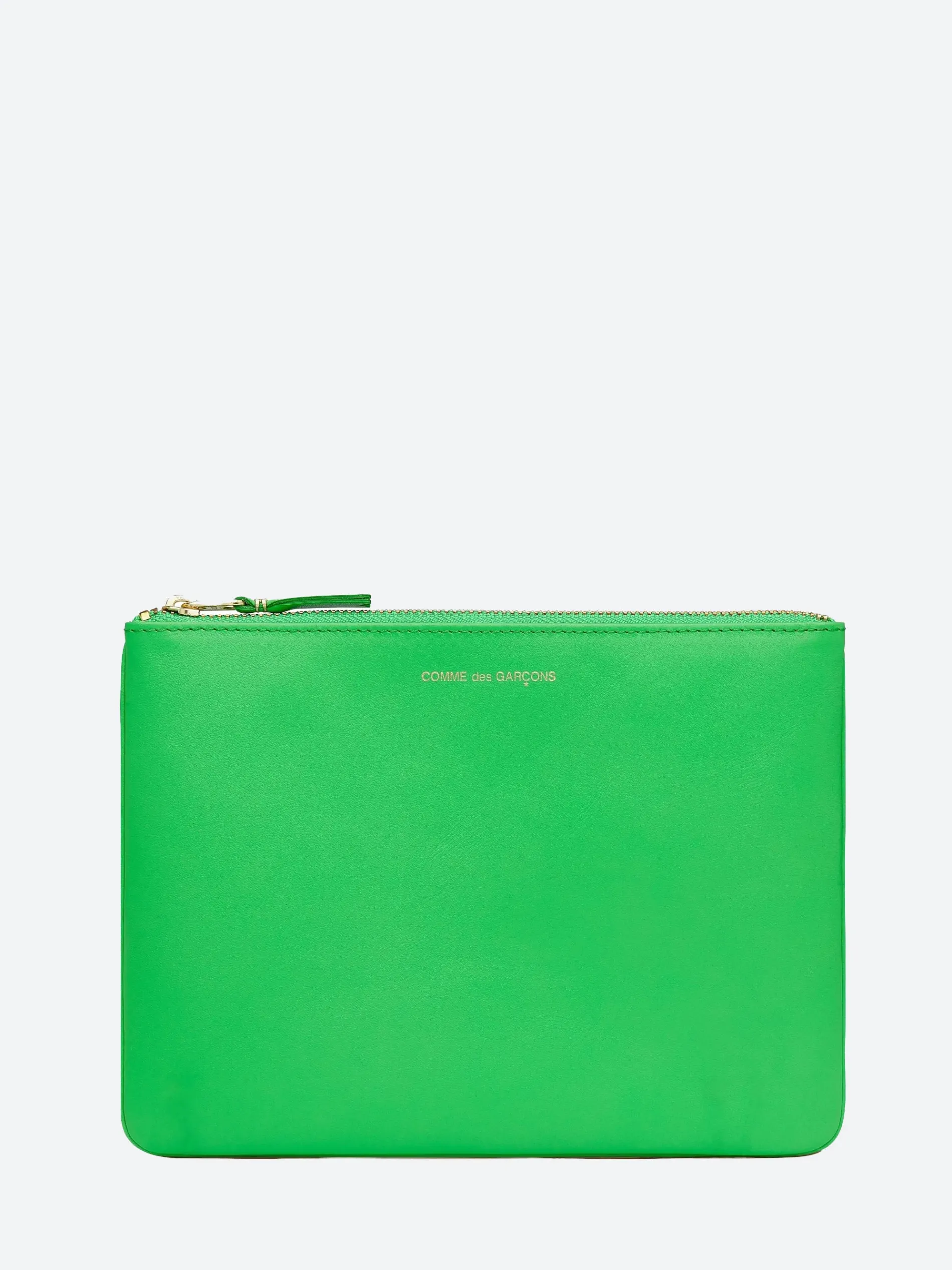 Green leather pouch wallet or clutch with single gold-tone zip. This is a great option for when a size between a bag and a wallet is needed. Carry as a clutch or small portfolio.